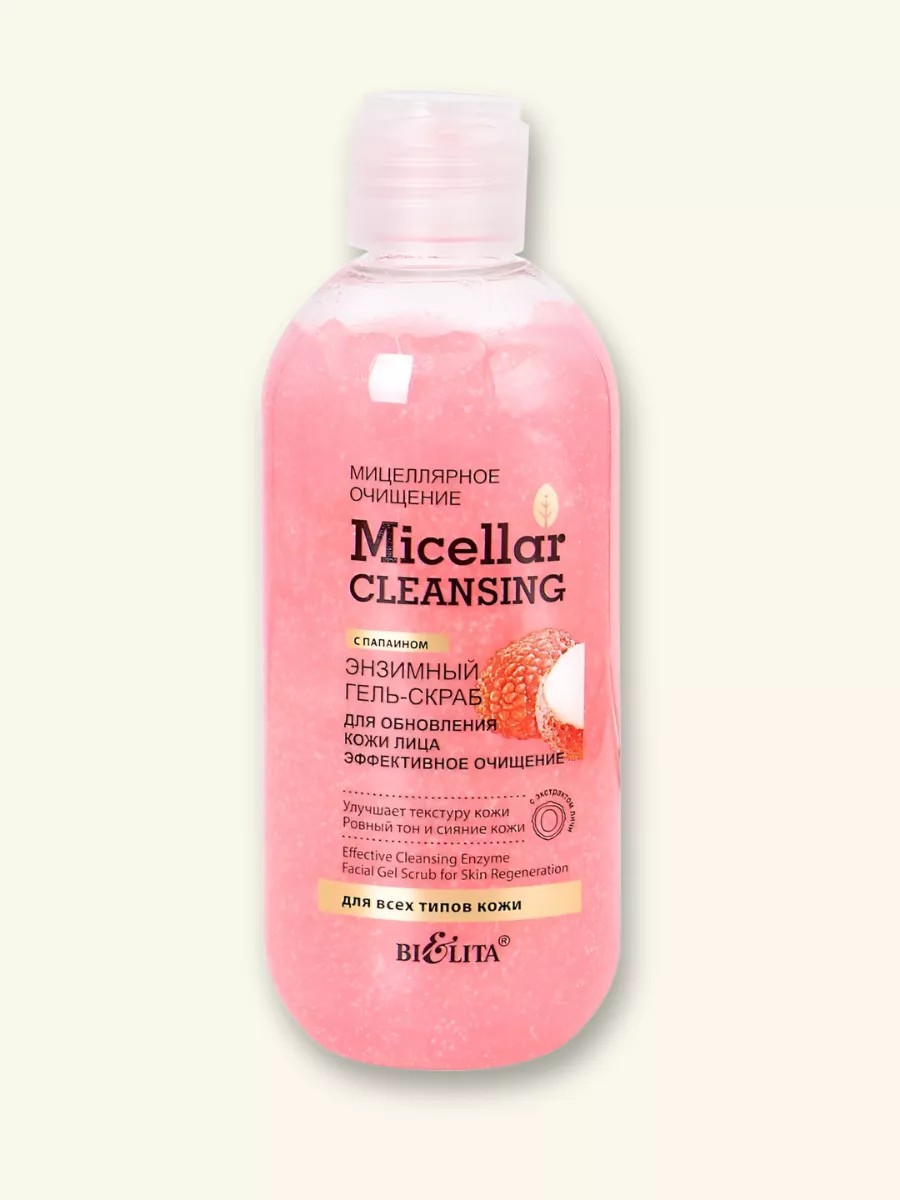 This enzyme gel scrub for facial skin renewal is an effective way to deeply cleanse the skin. Papain promotes active exfoliation, followed by cell regeneration, reduces inflammation, and accelerates healing. Lychee berry extract combats free radicals and prevents premature aging. A complex of active ingredients deeply moisturizes tissues, protects against dehydration, reduces signs of fatigue, improves the skin's appearance, and restores an even tone and natural radiance. Directions: Apply to damp skin, massage in, and rinse with water.