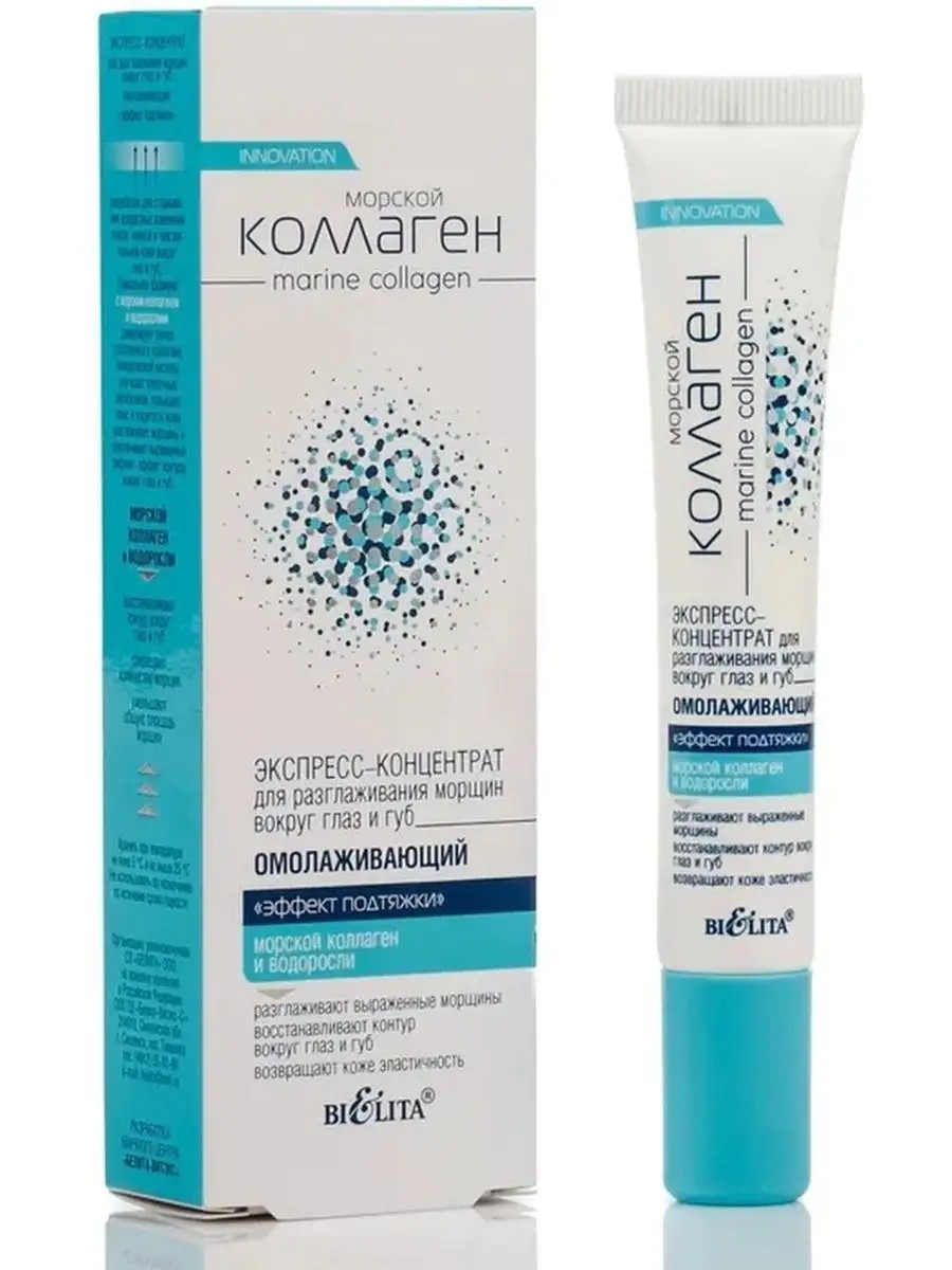 БЕЛИТА МОРСКОЙ КОЛЛАГЕН Экспресс-концентрат "ЭФФЕКТ ПОДТЯЖКИ" для разглаживания морщин вокруг глаз и губ 20мл. Разработан для сглаживания возрастных изменений тонкой и нежной кожи вокруг глаз и губ. Стимулирует синтез коллагена, гиалуроновой кислоты, повышает тонус и упругость кожи, разглаживает морщины и обеспечивает выраженный лифтинг-эффект контура вокруг глаз и губ. Комплекс активных компонентов: разглаживает выраженные морщины восстанавливает контур вокруг глаз и губ возвращает коже гладкость и эластичность Активные компоненты: морской коллаген, бурые водоросли, Ambre Oceane , Easyliance Tens"Up , масло миндаля. Эффект для кожи Подтягивающий / Разглаживающий / Омолаживающий (антивозрастной) / Тонизирующий / Лифтинг Решаем проблему на лице Против морщин / Против темных кругов под глазами Пол и возраст Женский Зона применения Для век Способ применения Нанести на чистую сухую кожу Активные компоненты.