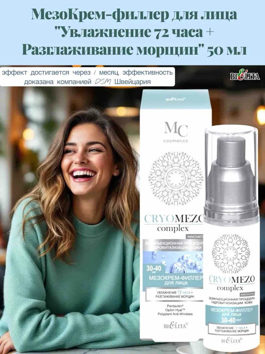 Optim Hyal stimulates the synthesis of hyaluronic acid, restores its optimal balance, increases skin hydration, improves its elasticity, density, and firmness, smoothes wrinkles, and reduces imperfections. Polyplant Anti-Wrinkles corrects wrinkles, improves collagen synthesis, and provides antioxidant protection. Nicotinamide (vitamin B3) reduces wrinkles, hydrates the skin, prevents water loss, and improves skin barrier function.