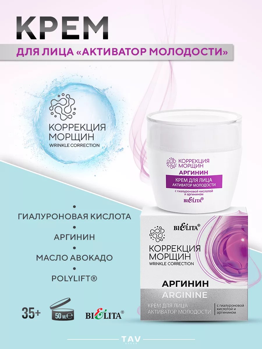 Youth Activator Face Cream with Hyaluronic Acid and Arginine. This highly active anti-aging face cream will help preserve the biological youth of your skin. The rich formula of the cream helps smooth out expression wrinkles, improve facial contours, and increase skin elasticity. The skin instantly becomes more hydrated, smooth, and firm, restoring its natural radiance. Suitable for all skin types. Hyaluronic acid forms a thin, breathable film on the surface of the epidermis, sealing moisture inside, increasing skin firmness and elasticity. Arginine stimulates collagen production, smoothes wrinkles, and improves complexion. Avocado oil deeply nourishes the skin, leaving it smooth and velvety. Polylift, an active ingredient based on sweet almond proteins, evens out skin microrelief, instantly reducing wrinkles and tightening facial contours. Directions: Apply morning and/or evening to cleansed skin. Purpose: Moisturizing. Nourishing. Elasticity. Between the ages of 35 and 40, the skin of the face and neck begins to gradually sag, and stress and the modern pace of life exacerbate the process. It is due to the breakdown of protein bonds that the facial contours lose their definition. Intensive anti-aging effects are made possible by the active ingredients of the new "Wrinkle Correction. Arginine" line. Arginine is an essential amino acid that eliminates skin imperfections; strengthens turgor and improves epidermal tone; stimulates skin renewal and rejuvenation; reduces hyperpigmentation and provides a lifting effect.