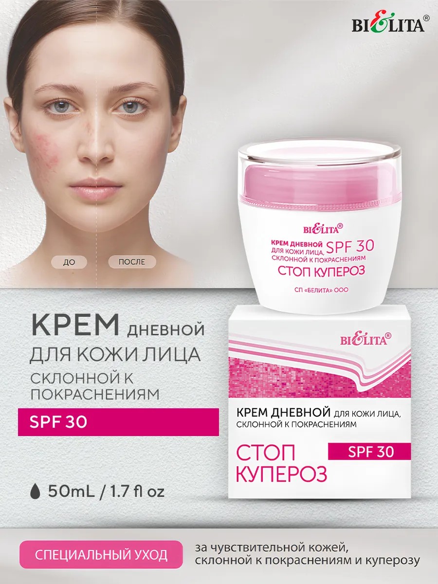 Крем дневной для кожи лица склонной к покраснениям SPF 30, специально создан для ухода за чувствительной кожей, склонной к покраснениям. Крем защищает кожу от УФ-лучей и обеспечивает надежную защиту от покраснений. Основные активные компоненты и их преимущества: Азелаиновая кислота эффективно борется с угревой сыпью и помогает уменьшить гиперпигментацию, обеспечивая ровный тон кожи. Уникальный комплекс, который контролирует покраснения кожи. Он помогает укрепить стенки сосудов, уменьшает их видимость, возвращает коже здоровый цвет. Экстракт листьев центеллы стимулирует процессы заживления и регенерации кожи. Обладает сосудоукрепляющим эффектом и улучшает эластичность. Масло косточек винограда обогащает кожу питательными веществами, повышает её упругость и эластичность, а также восстанавливает защитные функции эпидермиса. Бетаин и аллантоин совместно увлажняют и успокаивают кожу, защищая её от раздражений и потери влаги. Обеспечивает, комплексный подход к решению вопросов, связанных с куперозом и розацеа. Применение: Перед выходом на улицу. Нанесите равномерно крем на очищенную кожу лица за 15-20 минут до выхода на улицу.