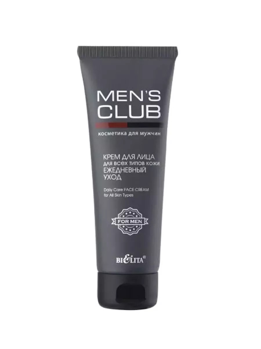 Белита Mens Club Крем для лица Ежедневный уход для всех типов кожи, 75 мл, 1 шт. Крем для лица — эффективное средство для ежедневного полноценного ухода. Интенсивно увлажняет, снимает ощущение сухости и стянутости, предотвращает преждевременное появление морщин. Средство разработано с учётом особенностей мужской кожи. Аллантоин, декспантенол, масло косточек абрикоса поддерживают водный баланс кожи, успокаивают и смягчают. Кофеин заряжает её энергией, ускоряя восстановление и обновление. Растительный комплекс стимулирует синтез коллагена, способствует восстановлению эластичности кожи, разглаживает морщины.