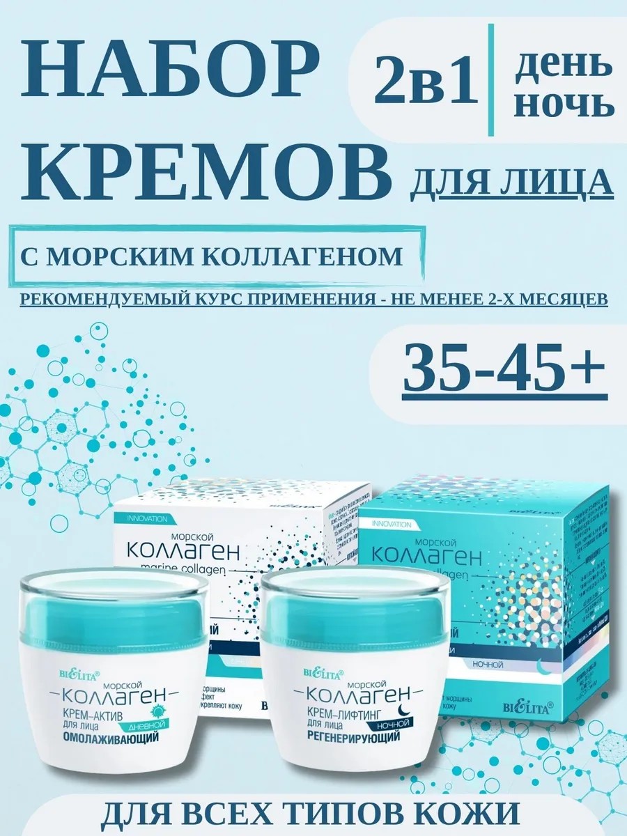 The Belita face cream set is the perfect gift for beauty-conscious women 35+. The set includes day and night creams, 50 ml each, designed specifically to moisturize, tone, and rejuvenate the skin of the face, neck, and décolleté.