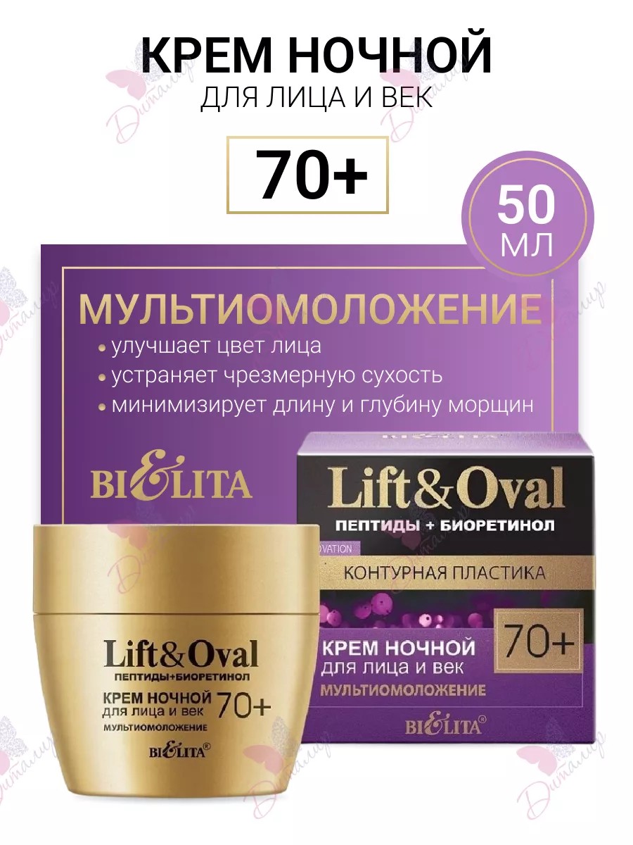 Ночной крем для лица и век Lift&Oval Мультиомоложение +70 — это ваш надежный помощник в борьбе с возрастными изменениями кожи. Этот крем для лица питательный и ночной, благодаря уникальному комплексу активных компонентов эффективно сокращает морщины, улучшает цвет лица и восстанавливает упругость кожи, обеспечивая интенсивное омолаживающее действие. Масла чиа и косточек абрикоса глубоко питают и увлажняют, а бетаин смягчает и разглаживает, придавая коже здоровый вид. Этот увлажняющий крем для лица для сухой кожи, обогащенный пептидами и коллагеном, — идеальное решение для вечернего ухода, особенно для тех, кто ищет антивозрастной эффект и лифтинг. Крем эффективно борется против пигментации, подтягивает и укрепляет кожу, обеспечивая легкий и глубокий уход, что делает его подходящим даже для очень чувствительной кожи. Крем для лица от морщин Lift&Oval — это сочетание корейской и израильской косметики, специально разработанное для борьбы с морщинами. Этот восстанавливающий крем для лица с коллагеном не только омолаживает, но и активно подтягивает кожу, делая её более упругой и свежей. Как часть премиум косметики для лица, он предлагает комплексный антивозрастной уход, который заметно уменьшает морщины и улучшает текстуру кожи. Благодаря своему питательному составу, этот крем для лица питательный увлажняющий станет вашим незаменимым помощником в вечернем ритуале красоты. Позвольте себе роскошь использовать крем для лица антивозрастной от морщин, который подарит вашей коже свежесть, молодость и сияние, а также обеспечит надежную защиту от негативных внешних факторов. Выбирайте Lift&Oval и наслаждайтесь результатами каждое утро!