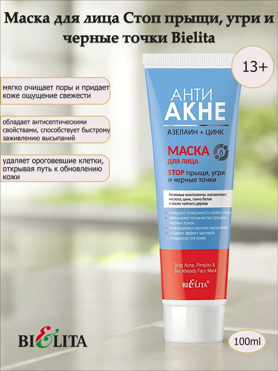 | Полное наименование товара | Маска для лица "Stop прыщи, угри и черные точки" 100мл. Линия Анти Акне. Азелаин+Цинк. Belita |