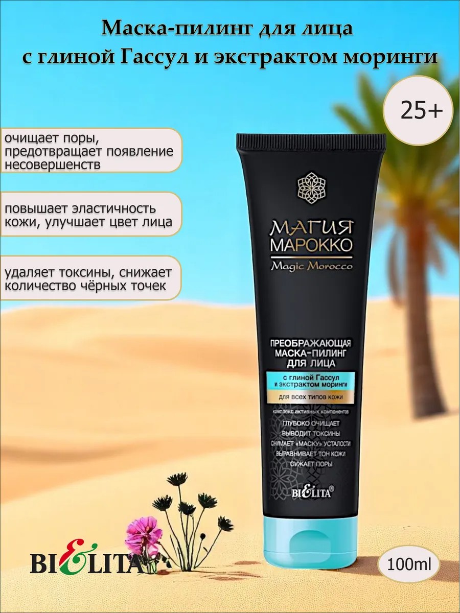Преображающая маска-пилинг для лица с глиной Гассул и экстрактом моринги от Белита разработана для глубокого очищения, выравнивания текстуры кожи и возвращения ей естественного сияния.