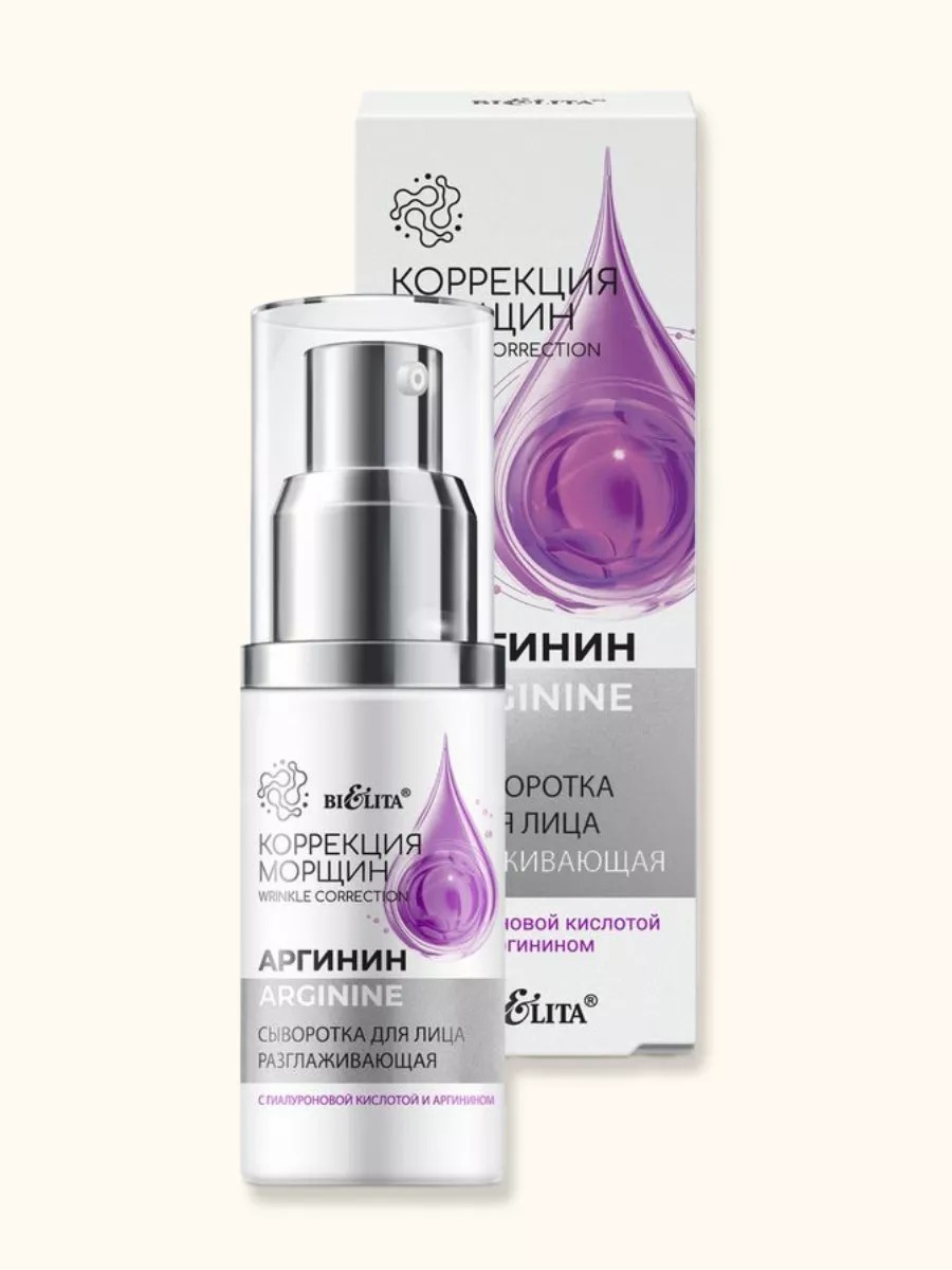 Smoothing face serum with hyaluronic acid and arginine 30 ml is an essential product for intensive care of aging skin. The serum's active ingredients deeply moisturize and nourish the skin, improve complexion, stimulate collagen and elastin production, and reduce fine lines around the lips, crow's feet around the eyes, and frown lines. Suitable for all skin types. Hyaluronic acid forms a thin, breathable film on the surface of the epidermis, sealing moisture inside and improving skin firmness and elasticity. Arginine and Toniskin stimulate collagen production, smooth wrinkles, and improve complexion. They give tired skin freshness and a natural glow. Shea and jojoba oils intensively nourish and soften the skin. Directions: Apply morning and/or evening to cleansed skin. Made in Belarus.