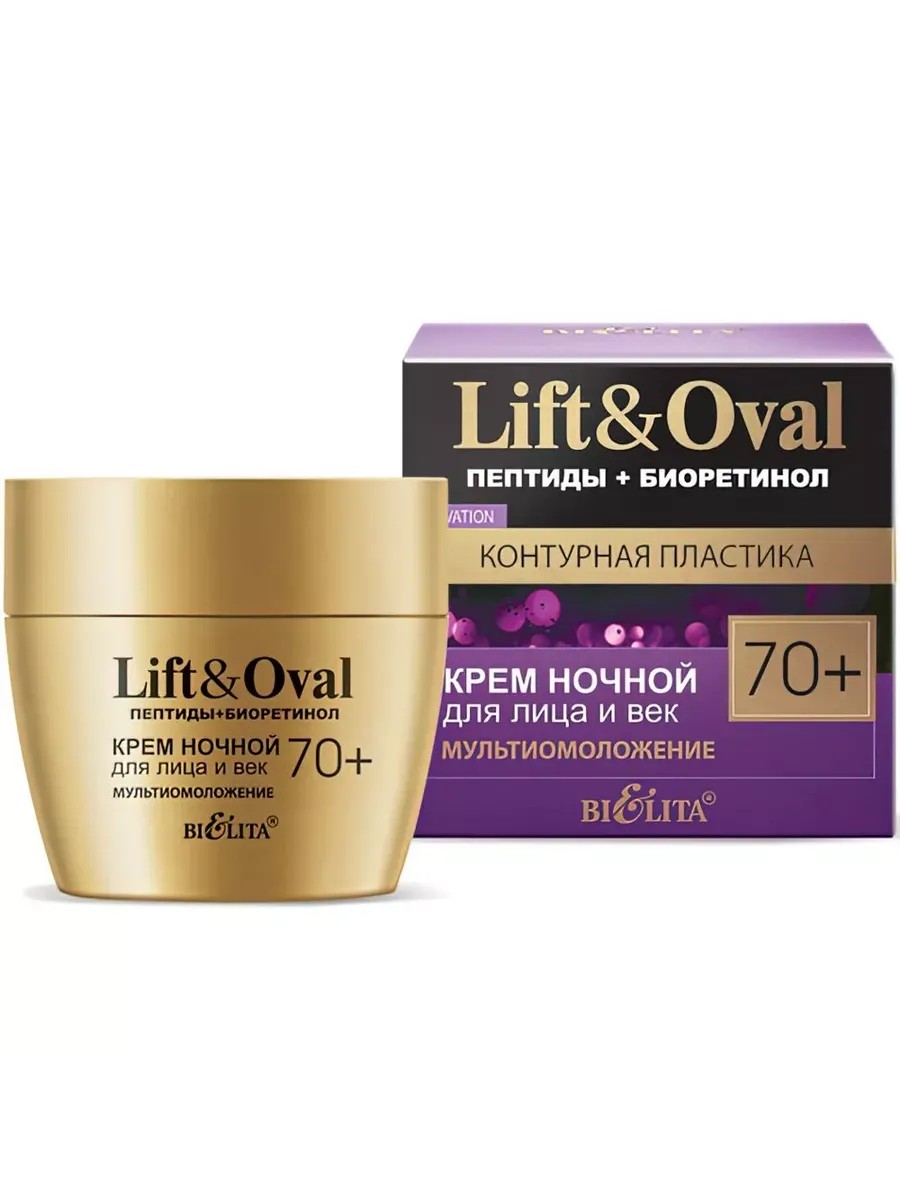 Belita Night Lift & Oval Multi-Rejuvenation Face and Eye Cream 70+, 50 ml. This night cream is designed to effectively reduce wrinkles caused by deep changes in the skin's microrelief. The active ingredient complex includes CS-Bakuchiol, 3Dermiiyn, chia oil, apricot and hazelnut kernel oil, betaine, and a rejuvenating peptide.