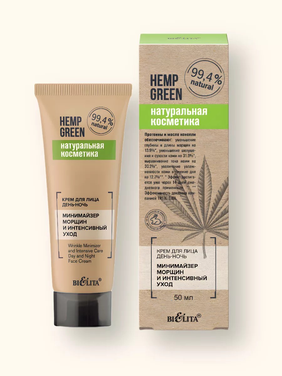 Hemp Green Day-Night Face Cream "Wrinkle Minimizer and Intensive Care," 50 ml. Proteins and hemp oil reduce the depth and length of wrinkles, reduce flaking and dry skin, even out skin tone, and increase skin hydration throughout the day. Directions: Apply morning and/or evening to cleansed skin. Made in Belarus.