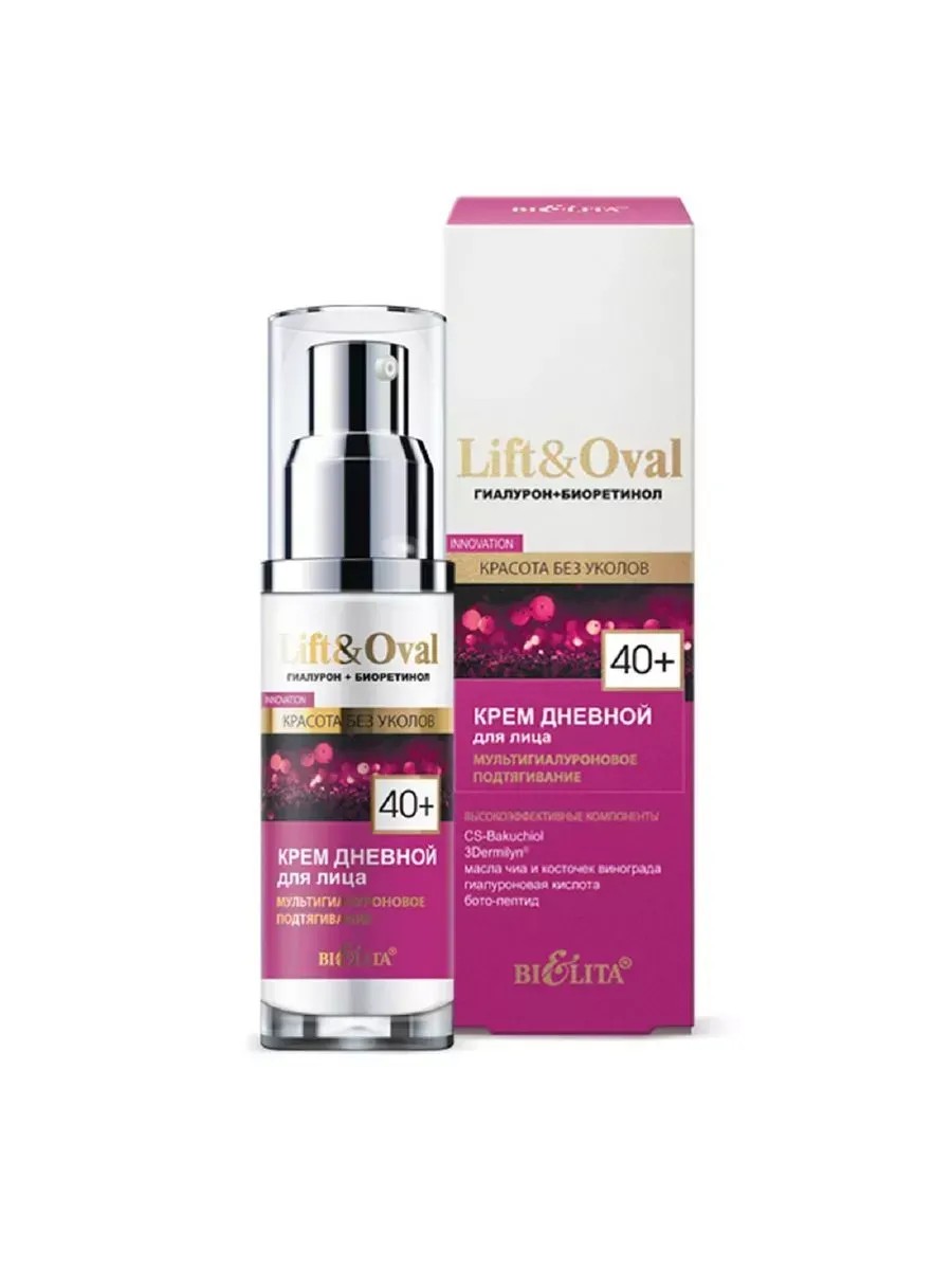 Belita, Lift&Oval Multi-hyaluronic Lifting Face Cream 50 ml. Day cream with a lifting and rejuvenating effect has been specially developed taking into account the physiology of mature skin after 40 years. The complex of active ingredients (CS-Bakuchiol, 3Dermilyn, chia and grape seed oils, low- and high-molecular hyaluronic acid, relaxing peptide): • provides a lifting effect • reduces expression wrinkles • restores the skin's natural radiance • maintains the necessary level of hydration The effect is achieved after 28 days of daily use. CS-Bakuchiol reduces hyperpigmentation, evens out tone, eliminates skin imperfections, and also has an anti-inflammatory effect. 3DERMILYN prevents premature aging, remodels the face oval and tightens the skin. Chia oil, thanks to its exceptional fatty acid composition, rejuvenates, firms, and moisturizes aging skin. Grape seed oil nourishes and hydrates the skin, improving its elasticity and promoting skin cell regeneration. Low-molecular-weight hyaluronic acid stimulates the skin's own hyaluronic acid production, providing a visible lifting effect and reducing wrinkle depth and skin roughness. High-molecular-weight hyaluronic acid hydrates and fills in fine wrinkles, making them less noticeable, helping to even out and smooth the skin's texture. A relaxing peptide inhibits facial muscle contractions, resulting in a reduction in the appearance of wrinkles on the face, neck, and décolleté.