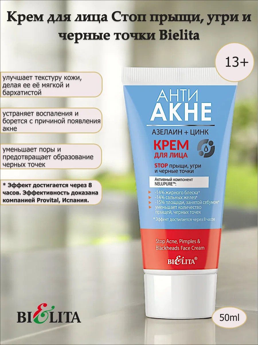 | Полное наименование товара | Крем для лица "Stop прыщи, угри и черные точки" 50мл. Линия Анти Акне. Азелаин+Цинк. Belita |