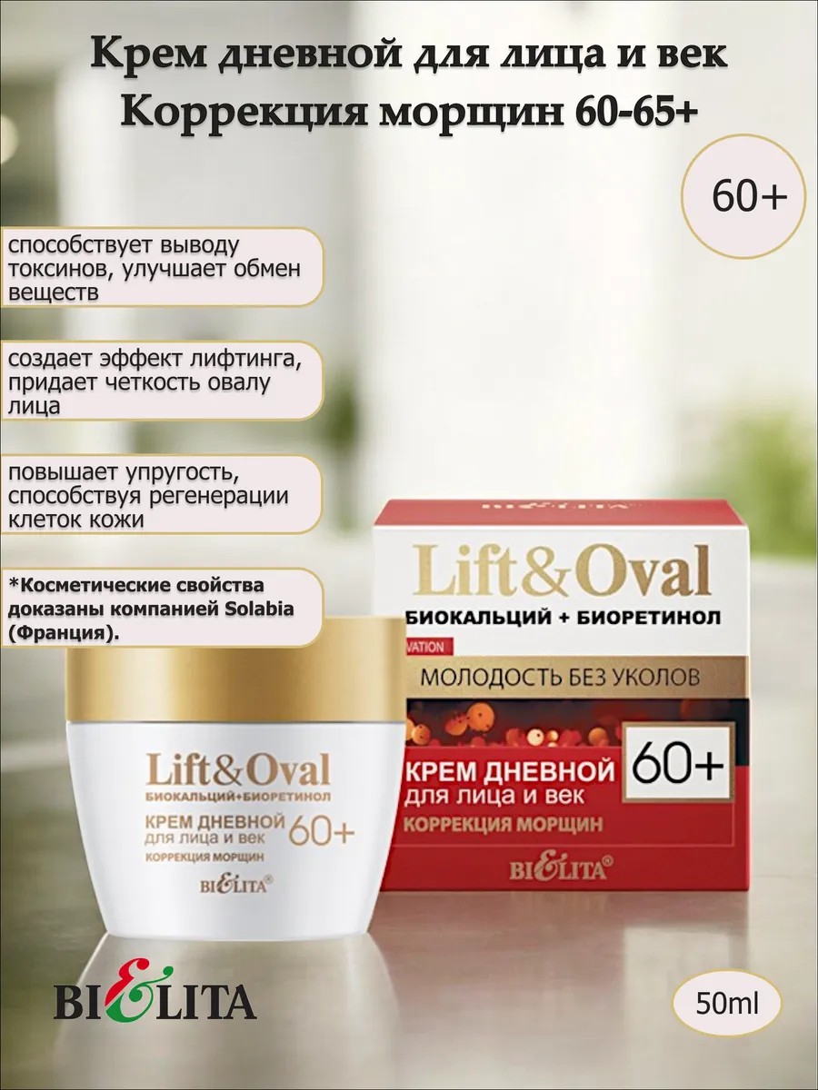 The Lift&Oval 60+ Wrinkle Correction Day Cream for Face and Eyes (Biocalcium + Bioretinol) is a specially formulated product for women aged 60 to 70 that helps maintain the natural beauty and well-groomed appearance of their skin.