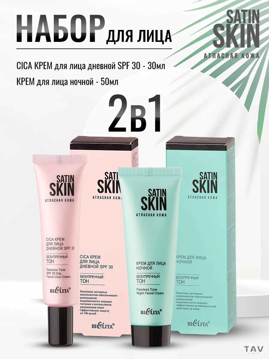 Набор для лица 2 в 1 "SATIN SKIN" для комплексного, полноценного и эффективного ухода за кожей лица. Cica крем для лица дневной SPF 30 «Безупречный тон» - популярный продукт для поддержания красоты, здоровья кожи: возвращает коже ровный тон и упругость, интенсивно увлажняет. Комплекс активных компонентов обеспечивает: уменьшение выраженности морщин; питание и интенсивное увлажнение кожи; эффективную защиту от УФ-лучей. Применение: нанесите утром на очищенную кожу лица. Крем для лица ночной «Безупречный тон» омолаживает, сокращает морщины, увеличивает упругость кожи, уменьшает ее усталость и улучшает тон. Комплекс активных компонентов обеспечивает: уменьшение выраженности морщин; эффективное антивозрастное действие на кожу. Применение: нанесите вечером на очищенную кожу лица. Назначение: Увлажнение; Питание; УФ-защита; Омоложение; Упругость.