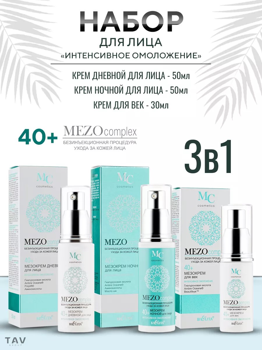 Антивозрастной набор 3 в 1 для лица 40+. МезоКРЕМ ДНЕВНОЙ для лица 40+ Интенсивное омоложение. Дневной мезокрем эффективно разглаживает морщины, увеличивает упругость и эластичность кожи, обеспечивает лифтинг-эффект, глубоко увлажняет кожу и восстанавливает оптимальный уровень увлажненности, активизирует клеточное обновление, улучшает цвет лица, делает кожу более гладкой и сияющей. Заполняет морщины, cтимулирует синтез коллагена и гиалуроновой кислоты, увеличивает упругость и эластичность кожи, усиливает клеточный метаболизм, защищает кожу от действия свободных радикалов, делает кожу более гладкой и сияющей. Обеспечивает эффект лифтинга, выравнивает микрорельеф, сокращает морщины. МезоКРЕМ НОЧНОЙ для лица 40+ Интенсивное омоложение. Ночной мезокрем активно стимулирует процессы клеточного обновления и синтез гиалуроновой кислоты во время сна. Повышает плотность и упругость кожи, улучшает ее структуру, заметно уменьшает морщины. Восстанавливает оптимальный уровень увлажненности кожи, обеспечивает полноценное питание. Заполняет морщины, стимулирует синтез коллагена и гиалуроновой кислоты, увеличивает упругость и эластичность кожи, усиливает клеточный метаболизм, защищает кожу от действия свободных радикалов, делает кожу более гладкой и сияющей. Мезокрем для век уменьшает припухлости и темные круги под глазами, разглаживает морщины, оказывает подтягивающее действие, восстанавливает оптимальный уровень увлажненности кожи век, усиливает микроциркуляцию. Заполняет морщины, стимулирует синтез коллагена и гиалуроновой кислоты, увеличивает упругость и эластичность кожи, усиливает клеточный метаболизм, защищает кожу от действия свободных радикалов, делает кожу более гладкой и сияющей. ВНИМАНИЕ: активная формула — возможно пощипывание.