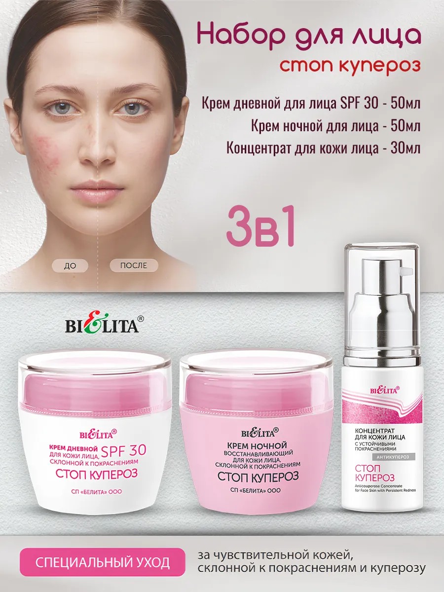 Набор для кожи лица склонной к покраснениям, специально создан для ухода за чувствительной кожей, склонной к покраснениям. Крем дневной защищает кожу от УФ-лучей и обеспечивает надежную защиту от покраснений. Крем ночной обеспечивает глубокое восстановление и увлажнение в ночное время, когда кожа наиболее восприимчива к питательным веществам. Концентрат для кожи лица с устойчивыми покраснениями специально разработан для борьбы с покраснениями и укрепления сосудов. Основные активные компоненты и их преимущества: Азелаиновая кислота эффективно борется с угревой сыпью и помогает уменьшить гиперпигментацию, обеспечивая ровный тон кожи. Уникальный комплекс, который контролирует покраснения кожи. Он помогает укрепить стенки сосудов, уменьшает их видимость, возвращает коже здоровый цвет. Экстракт листьев центеллы стимулирует процессы заживления и регенерации кожи. Обладает сосудоукрепляющим эффектом и улучшает эластичность. Масло косточек винограда обогащает кожу питательными веществами, повышает её упругость и эластичность, а также восстанавливает защитные функции эпидермиса. Бетаин и аллантоин совместно увлажняют и успокаивают кожу, защищая её от раздражений и потери влаги. Обеспечивает, комплексный подход к решению вопросов, связанных с куперозом и розацеа.