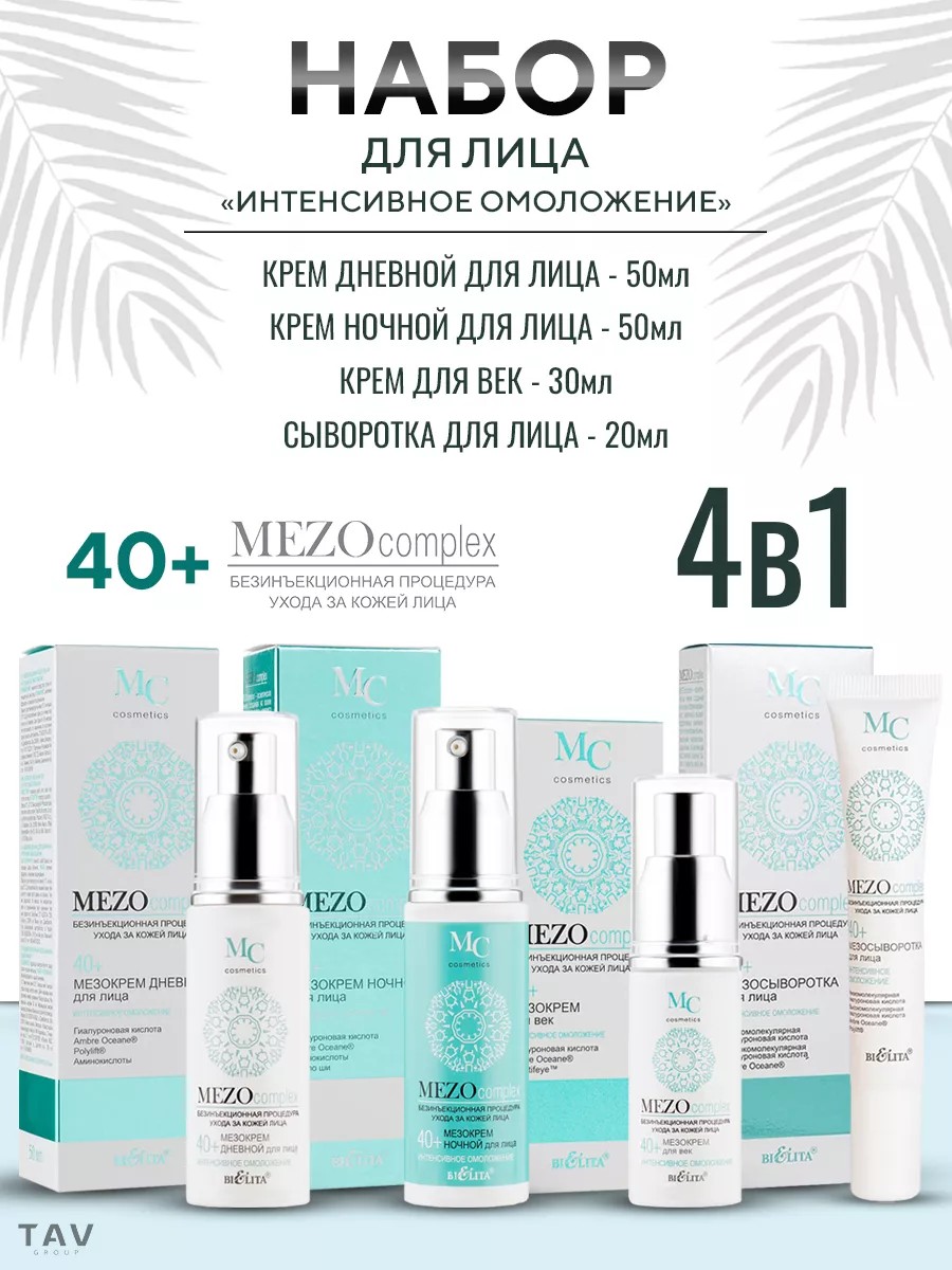 Антивозрастной набор 4 в 1 для лица 40+. МезоКРЕМ ДНЕВНОЙ для лица 40+ эффективно разглаживает морщины, увеличивает упругость и эластичность кожи, обеспечивает лифтинг-эффект, глубоко увлажняет кожу и восстанавливает оптимальный уровень увлажненности, активизирует клеточное обновление, улучшает цвет лица, делает кожу более гладкой и сияющей. Заполняет морщины, увеличивает упругость и эластичность кожи, усиливает клеточный метаболизм, защищает кожу от действия свободных радикалов, делает кожу более гладкой и сияющей. МезоКРЕМ НОЧНОЙ для лица 40+ активно стимулирует процессы клеточного обновления и синтез гиалуроновой кислоты во время сна. Повышает плотность и упругость кожи, улучшает ее структуру, заметно уменьшает морщины. Восстанавливает оптимальный уровень увлажненности кожи, обеспечивает полноценное питание. Заполняет морщины, увеличивает упругость и эластичность кожи, усиливает клеточный метаболизм, защищает кожу от действия свободных радикалов, делает кожу более гладкой и сияющей. Мезокрем для век уменьшает припухлости и темные круги под глазами, разглаживает морщины, оказывает подтягивающее действие, восстанавливает оптимальный уровень увлажненности кожи век, усиливает микроциркуляцию. Заполняет морщины, стимулирует синтез коллагена и гиалуроновой кислоты, увеличивает упругость и эластичность кожи, усиливает клеточный метаболизм, защищает кожу от действия свободных радикалов, делает кожу более гладкой и сияющей. МезоСЫВОРОТКА для лица активно насыщает кожу влагой, обеспечивая двойной эффект увлажнения — снаружи и изнутри, стимулирует обменные процессы, повышает упругость и эластичность кожи, разглаживает морщины и улучшает цвет лица. Заполняет морщины, стимулирует синтез коллагена и гиалуроновой кислоты, увеличивает упругость и эластичность кожи, усиливает клеточный метаболизм, защищает кожу от действия свободных радикалов, делает кожу более гладкой и сияющей. ВНИМАНИЕ: активная формула — возможно пощипывание.