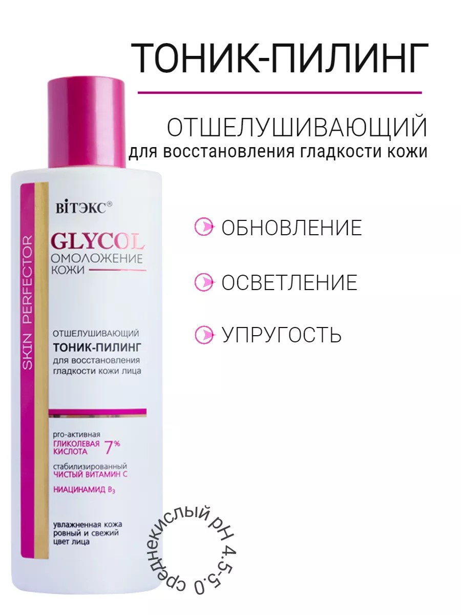 GLYCOL Отшелушивающий Тоник-Пилинг для восстановления гладкости кожи лица. Pro-активная Гликолевая Кислота 7%; стабилизированный Чистый Витамин С; Ниацинамид (витамин В3). Показания к применению: Тусклый, неровный цвет лица, Кожа с признаками увядания, Пигментация, постакне, Черные точки, расширенные поры. Обновление * Осветление * Упругость. Гликолевый тоник-бустер с богатым составом активных компонентов мягко отшелушивает ороговевшие клетки, восстанавливая гладкость и шелковистость кожи, увлажняет и повышает тонус. При регулярном применении цвет лица становится более свежим и ярким. Ультраэффективная комбинация активных компонентов. PRO-активная Гликолевая Кислота и Энзимы Папайи мягко, но эффективно отшелушивают, обновляют и полируют кожу, осветляют пигментацию, помогают восстановить гладкость и нежность. Стабилизированный Чистый Витамин С устраняет тусклость кожи, выравнивает тон, обеспечивает антиоксидантное действие. Ниацинамид и натуральный гель алоэ глубоко увлажняют кожу, улучшают ее упругость, разглаживают и освежают. Среднекислый рН 4.5-5.0 - Усиливает действие средств последующего ухода. Применение: нанесите на ватный диск, протрите кожу. Рекомендуется использовать ежедневно утром и вечером.