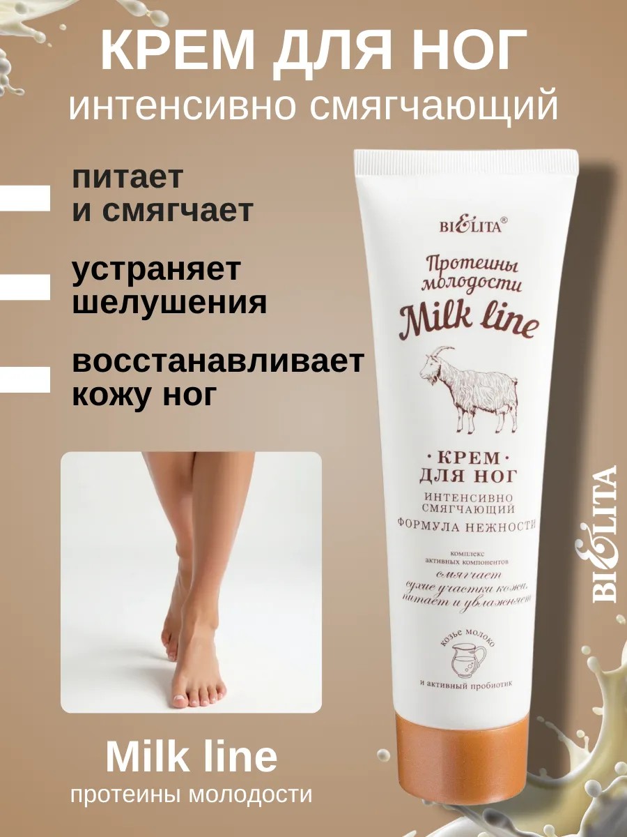 Крем для ног интенсивно смягчающий Формула нежности Milk Line Протеины молодости - оказывает многостороннее действие на кожу ног: питание, увлажнение, защита, смягчение, регенерация. Благодаря легкой, нежной текстуре крем легко наносится и быстро впитывается. Входящие в состав активные компоненты: козье молоко, пробиотик, кокосовое масло и комплекс витаминов A, C, E, F эффективно смягчают и восстанавливают кожу ног, снимают шелушение и сухость. Глубоко питают и увлажняют, придавая более грубым участкам ступней мягкость и гладкость.