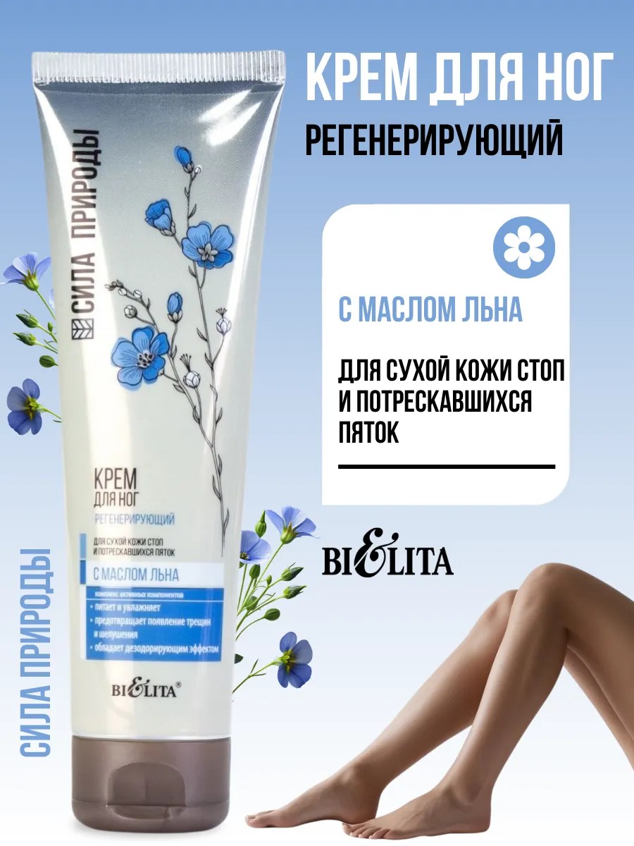 Regenerating foot cream with flaxseed oil for dry feet and cracked heels. The Power of Nature. Belita's regenerating foot cream with flaxseed oil will help your feet regain their former lightness, softness, health, and attractiveness.