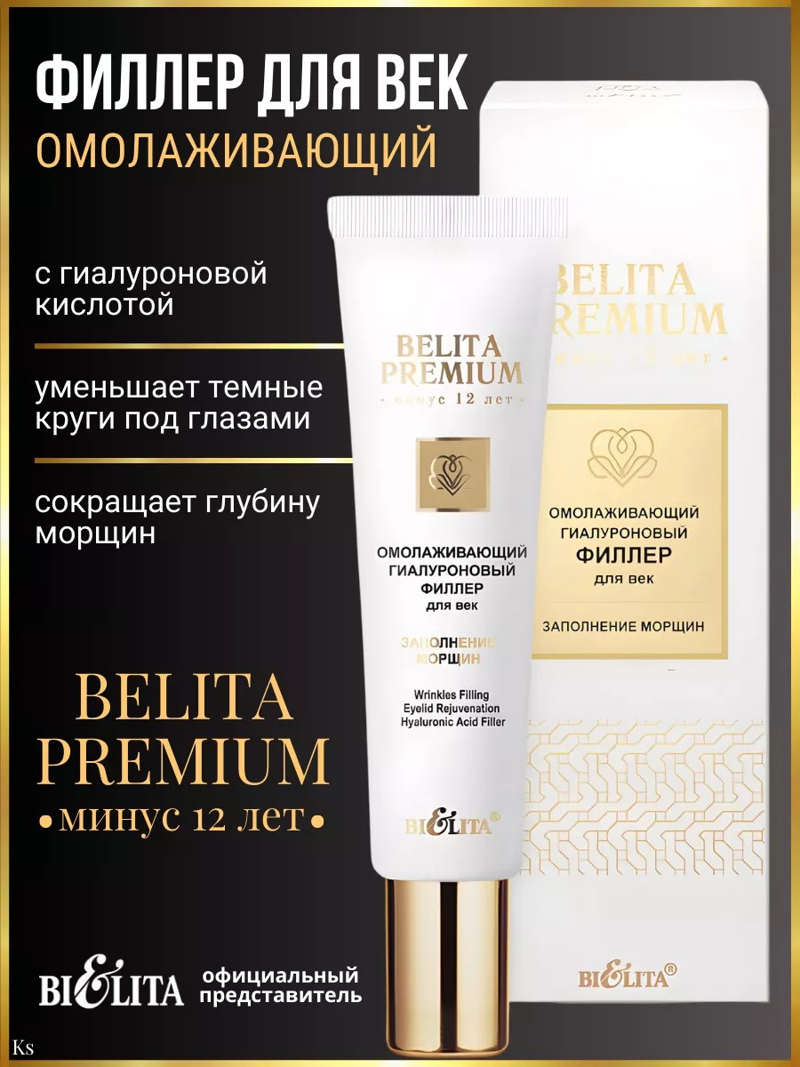Filling wrinkles Belita Premium. The high efficiency of the Rejuvenating hyaluronic filler for eyelids is due to a complex of active ingredients: targeted hyaluronic acid fills and visibly reduces the depth and number of wrinkles within a few hours.