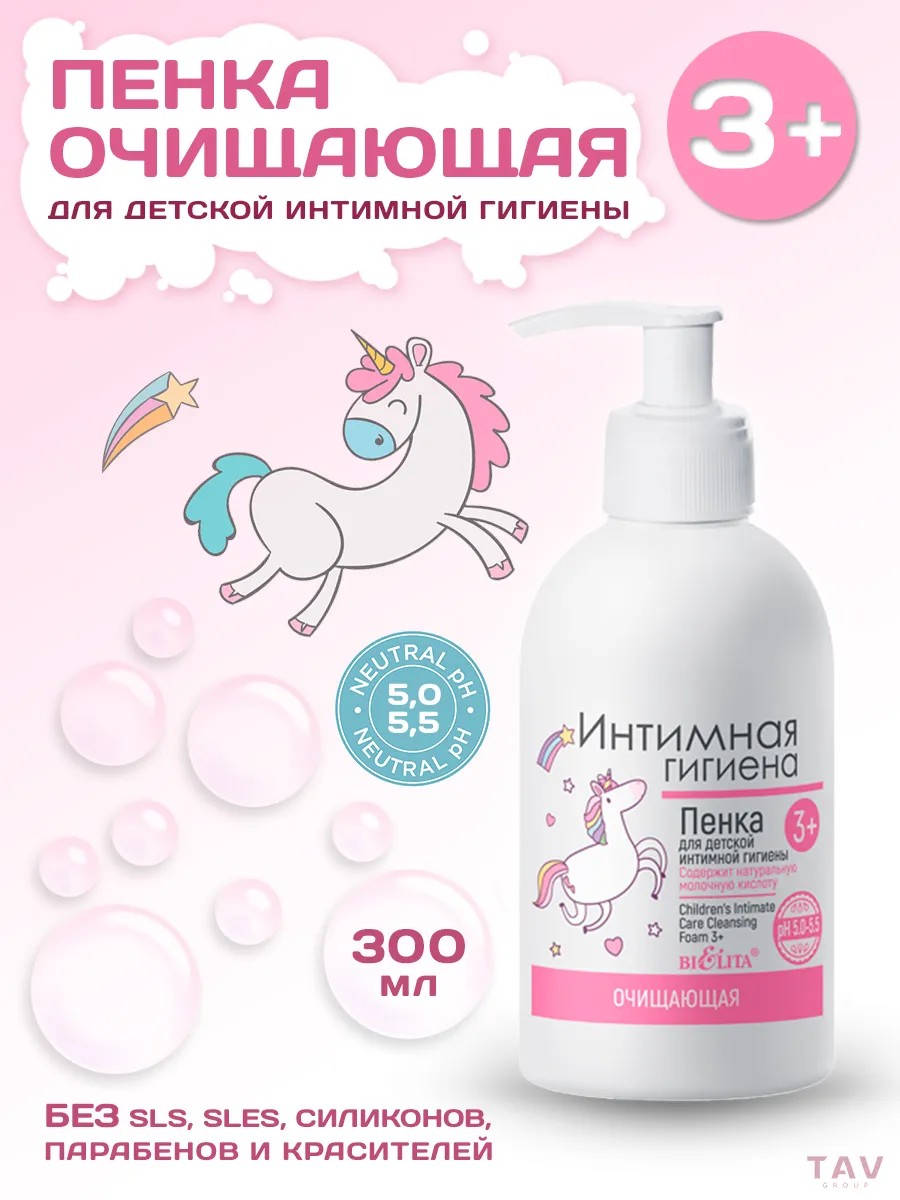 Пенка очищающая для детской интимной гигиены 3+. Обычное мыло сушит нежную детскую кожу наружных половых органов девочек. Для комфортной процедуры гигиены необходимо использовать пенку очищающую для детской интимной гигиены - уникальное средство для бережного ухода, специально созданное для девочек с 3-х лет. Мягкое очищение для нежной и чувствительной кожи поможет устранить чувство дискомфорта. Натуральная молочная кислота обеспечивает кислотность влагалищной среды, которая в свою очередь оказывает бактерицидное действие на патогенную флору, Д-пантенол обладает смягчающим и регенерирующим действием, экстракт алоэ — успокаивающее, защитное, освежающее, увлажняющее действие. В составе отсутствуют SLS, SLES, силиконы, парабены и красители. Применение: нанесите небольшое количество пенки на интимные участки тела, вспеньте, тщательно смойте водой.