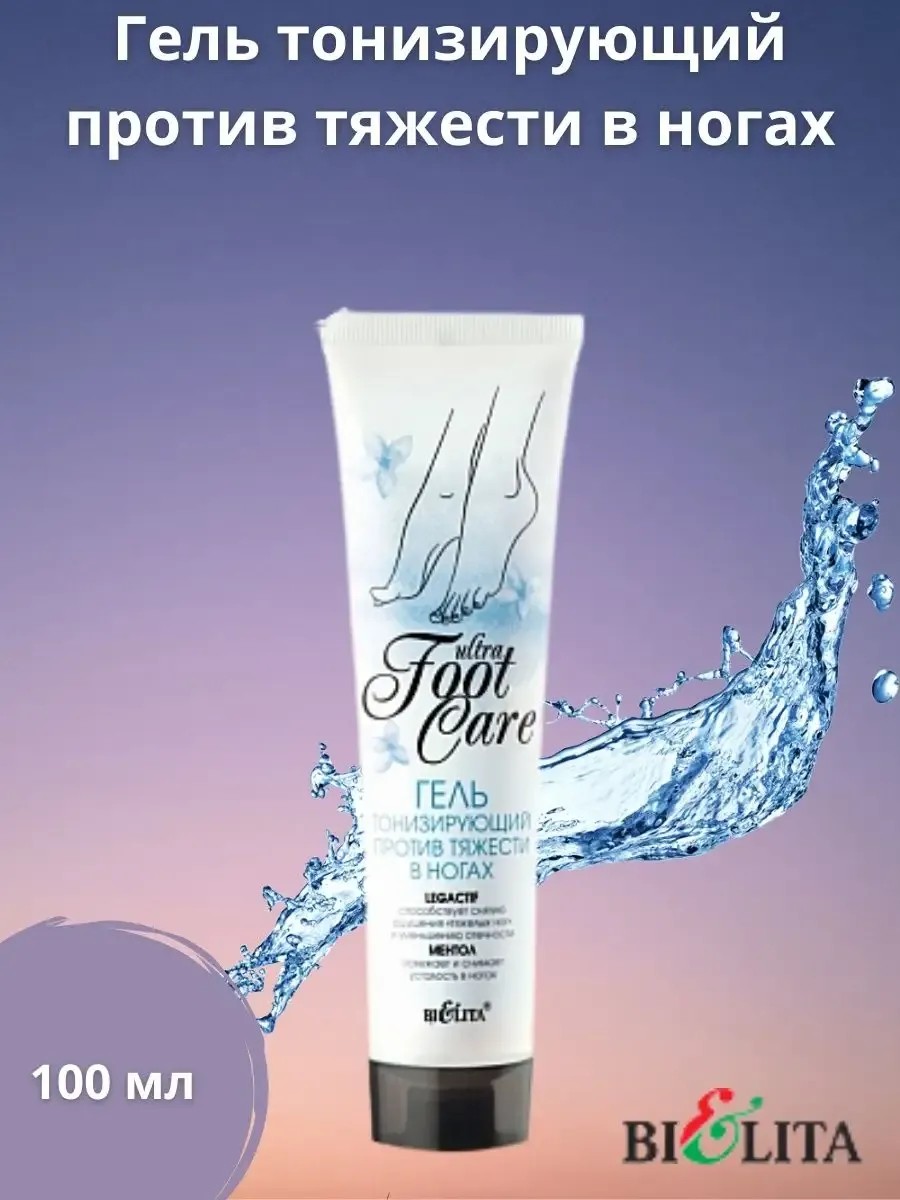 ULTRA FOOT CARE toning gel against heavy legs relieves the feeling of heaviness and fatigue in tired and swollen legs, restoring lightness, freshness, and comfort. LegActive and horse chestnut extract have venotonic properties: they help activate blood flow, relieve the feeling of heavy legs and reduce fluid in the tissues, improve circulation, strengthen the walls of blood vessels and increase their elasticity. Caffeine stimulates blood circulation, helping to reduce swelling in the tissues. Menthol cools and refreshes the skin. Products from a Belarusian brand, whose cosmetic care products are always a guarantee of quality and the choice of many customers. Put together a gift set of high-quality women's cosmetics, and it will be the best gift for a sister, mother, friend, girlfriend, or woman. We have promotions and sales, you can buy our products as gifts at a discount! Love yourself with Belita! The Belita brand's product range includes skincare, women's makeup, and pharmaceutical facial cosmetics.