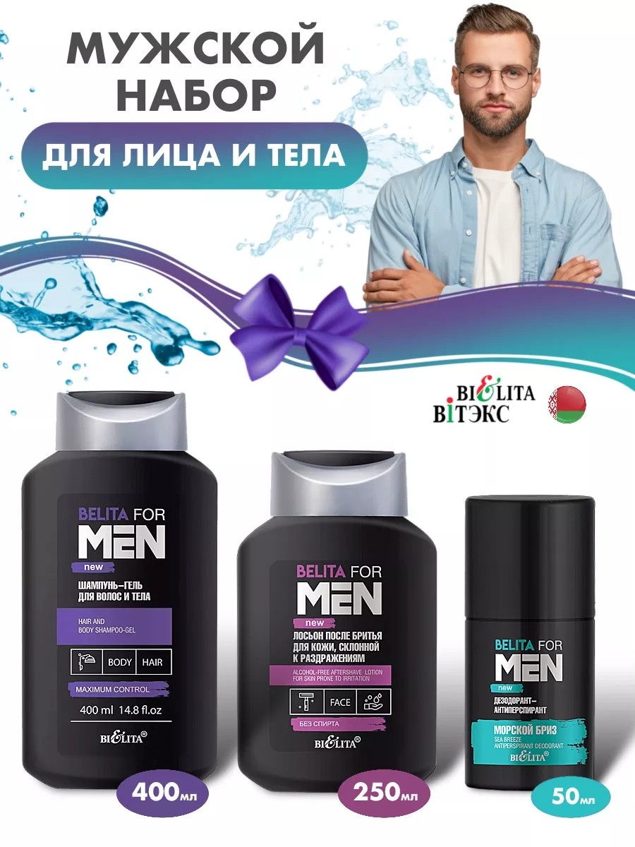 | Комплектация | Мужской Шампунь - гель для волос и тела Belita for Men 400 мл - 1 шт; Лосьон после бритья мужской - без спирта - Belita for Men 250 мл - 1 шт; Дезодорант - антиперспирант для мужчин "Морской бриз" Belita for Men 50 мл - 1 шт |