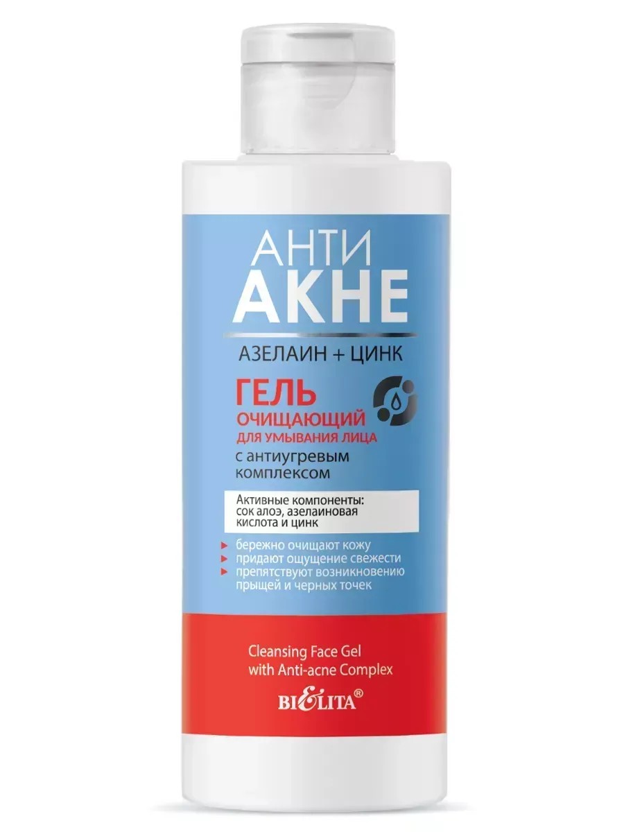 Белита Анти Акне Гель очищающий для умывания лица с антиугревым комплексом 150 мл, 1 штука. Идеальное решение для создания чистой, свежей, без пятен и прыщей, кожи. Он эффективно и при этом бережно очищает ее. Комплекс активных компонентов воздействует на бактерии, вызывающие акне, уменьшая воспаление и предотвращая появление новых высыпаний. Умывая лицо с помощью нашего геля, вы почувствуете освежающее ощущение от того, как его формула работает над очищением пор, удаляя загрязнения и излишки жира. Легкая и пенистая текстура обеспечивает тщательное очищение, не пересушивая и не раздражая кожу. Очищающий гель подходит для всех типов кожи. При постоянном использовании вы заметите видимые улучшения текстуры и тона кожи. Активные компоненты (сок алоэ, азелаиновая кислота и цинк): бережно очищают кожу придают ощущение свежести препятствуют возникновению прыщей и черных точек. Применение: нанесите на влажную кожу, вспеньте, смойте водой.