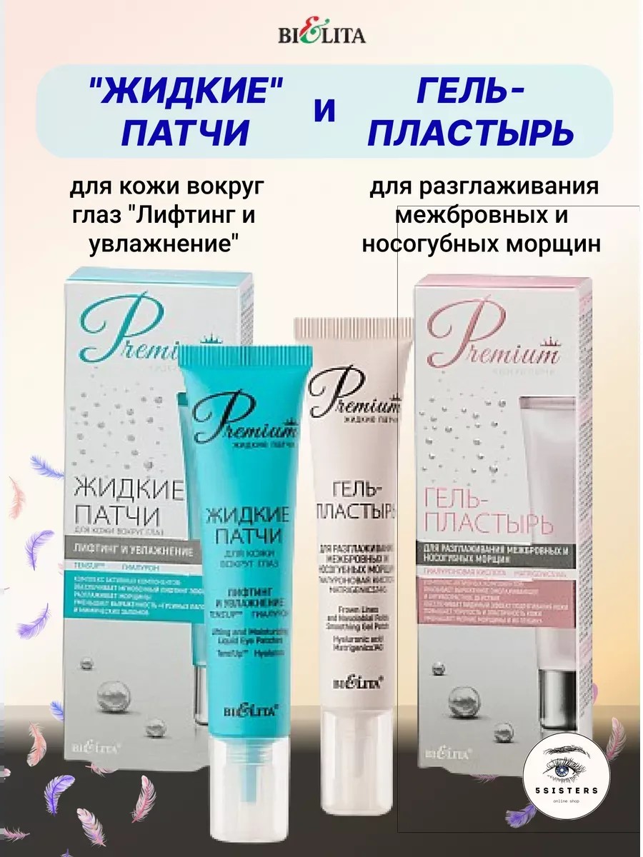 ЖИДКИЕ ПАТЧИ под глаза и ГЕЛЬ-ПЛАСТЫРЬ для разглаживания межбровных и носогубных морщин линии Premium Liquid Patches быстро приведут кожу в порядок, скрыв следы бессонной ночи и усталости, при этом обеспечат эффективный длительный уход.
