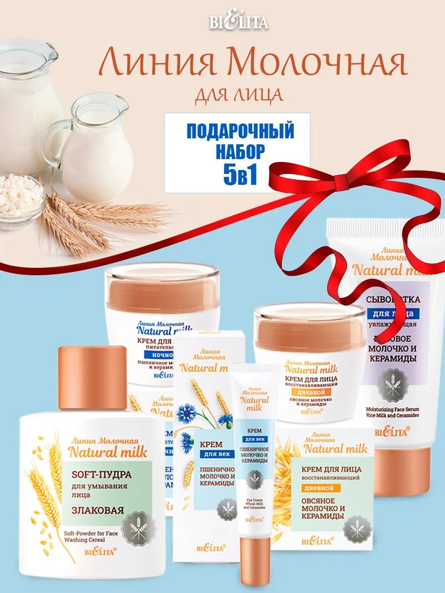 | Комплектация | крем для лица питательный ночной "Пшеничное молочко и керамиды"; крем для лица восстанавливающий дневной "Овсяное молочко и керамиды"; крем для век "Пшеничное молочко и керамиды"; сыворотка для лица увлажняющая "Рисовое молочко и керамиды"; SOFT-пудра для умывания лица. Злаковая |