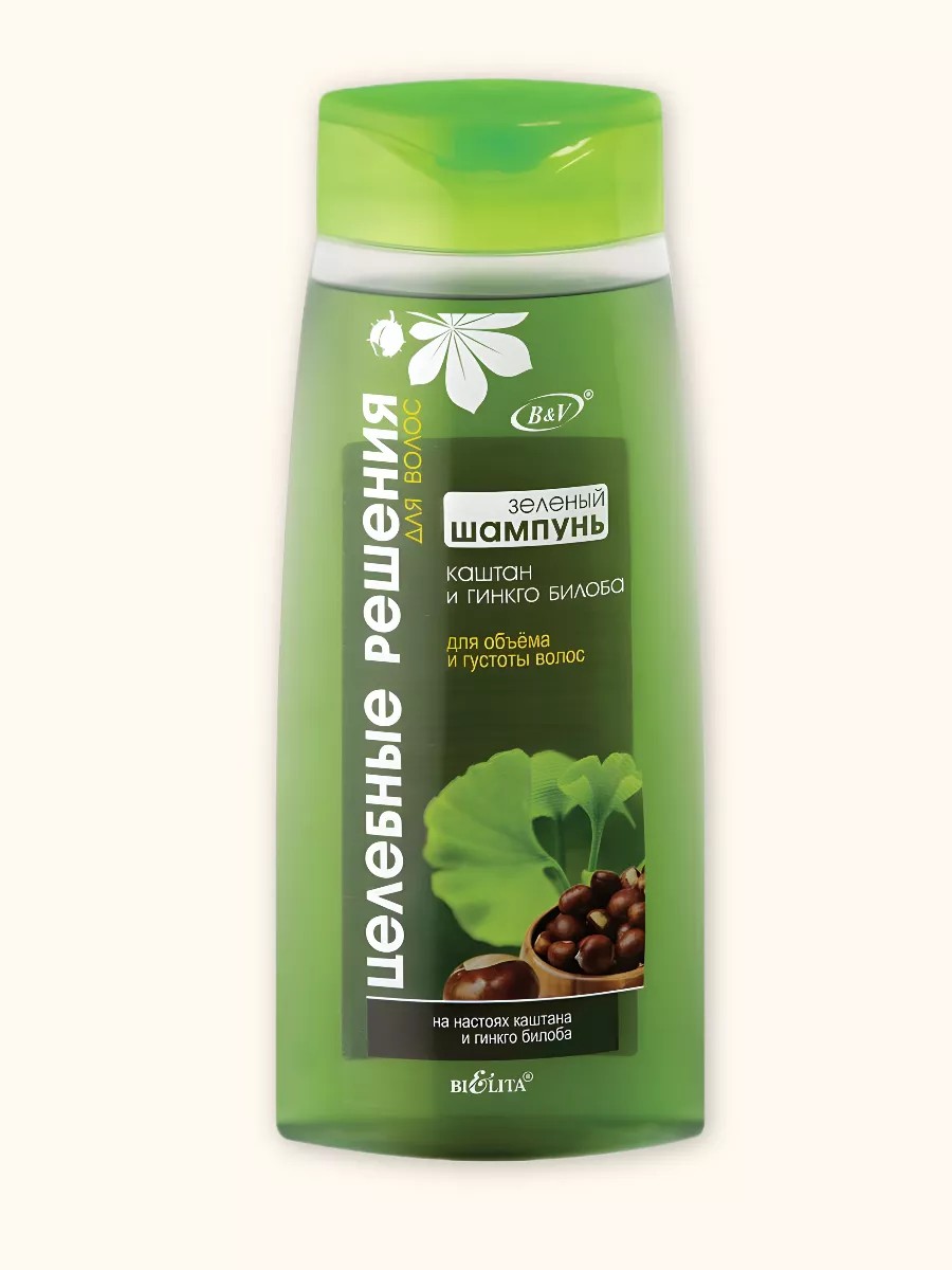 Green Shampoo for Volume and Thickness with Chestnut and Ginkgo Biloba, 480 ml. Fine and weak hair is fragile and vulnerable; it is very delicate, brittle, and easily tangled. Due to a lack of nutrition, it weakens, is prone to hair loss, and its ability to retain water is reduced. It needs to be nourished from the inside and outside, strengthening the hair follicles. Green Shampoo for Volume and Thickness with Chestnut and Ginkgo Biloba provides excellent care for fine and weak hair. Based on herbal infusions of chestnut and ginkgo biloba, which restore hair structure and make it more voluminous and strong. Chestnut strengthens hair follicles, improves growth, and promotes volume and thickness. Ginkgo biloba stimulates and restores the scalp's essential functions, nourishing and strengthening the hair. Directions: Apply to damp hair, lather, and rinse with water. Made in Belarus.