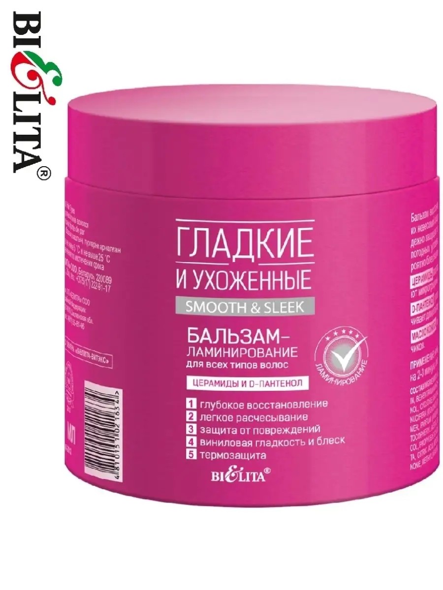 Бальзамы-ламинирование "Гладкие и ухоженные" от Belita — это идеальное решение для восстановления и ухода за всеми типами волос. Благодаря уникальной формуле, содержащей церамиды и масло кокоса, ваши волосы получат интенсивное питание и увлажнение, а также защиту от ломкости и секущихся кончиков. Бальзам создает невесомую защитную пленку, которая предотвращает электризацию и пушистость, придавая волосам невероятный блеск и гладкость. С этим бальзамом ваши волосы будут выглядеть ухоженными и здоровыми в любых погодных условиях, а эффект ламинирования подарит вам уверенность в своем образе. Не упустите возможность сделать ваши волосы по-настоящему красивыми и ухоженными! Бальзамы-ламинирование "Гладкие и ухоженные" — это уникальное средство из белорусской косметики, созданное специально для женских волос. Этот питательный бальзам эффективно восстанавливает даже самые сухие и поврежденные волосы, проникая в их пористую структуру. Благодаря тщательно подобранному составу, balzam обеспечивает глубокое питание и защиту, делая волосы гладкими и блестящими. Бальзам для волос из Беларуси — это надежный выбор для тех, кто ценит качество и эффективность. Если ваши волосы нуждаются в особом уходе, этот бальзам станет незаменимым помощником в их восстановлении и поддержании здоровья. Балтзам для волос "Гладкие и ухоженные" — это ваш путь к идеальным волосам, которые всегда выглядят великолепно.
