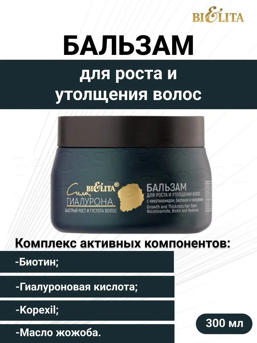 Бальзам для волос. Создан для роста и утолщения тонких волос.Комплекс активных компонентов (Биотин, Гиалуроновая кислота, Kopexil, Масло жожоба):- уплотняет волосы по всей длине- повышает упругость, эластичность и силу волос- усиливает рост волос- устраняет сухость и секущиеся кончики- возвращает локонам естественный блеск, ухоженный здоровый внешний вид.