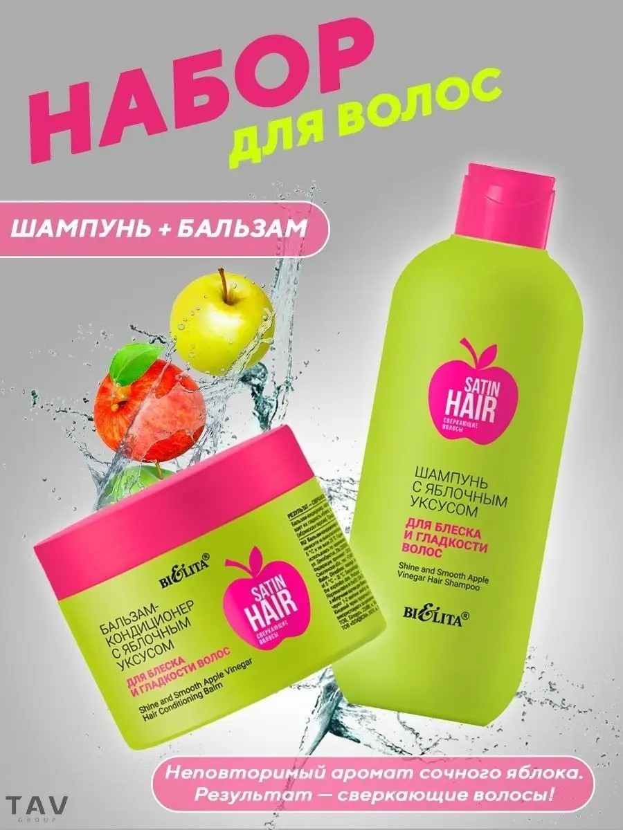 Набор SATIN HAIR состоит из двух средств: 1. Шампунь наполненный яблочным уксусом, очищает и улучшает состояние волос — разглаживает их, предотвращает ломкость и придает заметный блеск. Шампунь усилен концентратом фруктов абрикоса и персика для предотвращения ломкости и сечения волос. Комплекс активных компонентов обеспечивает:гладкость и кристальный блеск, предотвращение ломкости и сечения волос. Назначение: Блеск, Гладкость, Эластичность. Применение: нанесите на влажные волосы, вспеньте, смойте водой. 2. Бальзам-кондиционер для волос, наполненный яблочным уксусом, мягко распутывает волосы, усиливает их гладкость и блеск, сглаживает и закрывает чешуйки. Бальзам усилен концентратом фруктов абрикоса и персика для предотвращения ломкости и сечения волос. Придает волосам неповторимый аромат сочного яблока. Комплекс активных компонентов обеспечивает: устранение спутывания волос, упругость и эластичность, безупречное сияние и здоровый блеск. Назначение: Блеск, Гладкость, Эластичность. Применение: нанесите на вымытые волосы, через 1-2 минуты смойте водой. Нежные формулы средств с натуральными компонентами великолепно ухаживают за волосами, возвращают им здоровый, сверкающий блеск, делают мягкими и послушными. Линия подходит для всех типов волос.