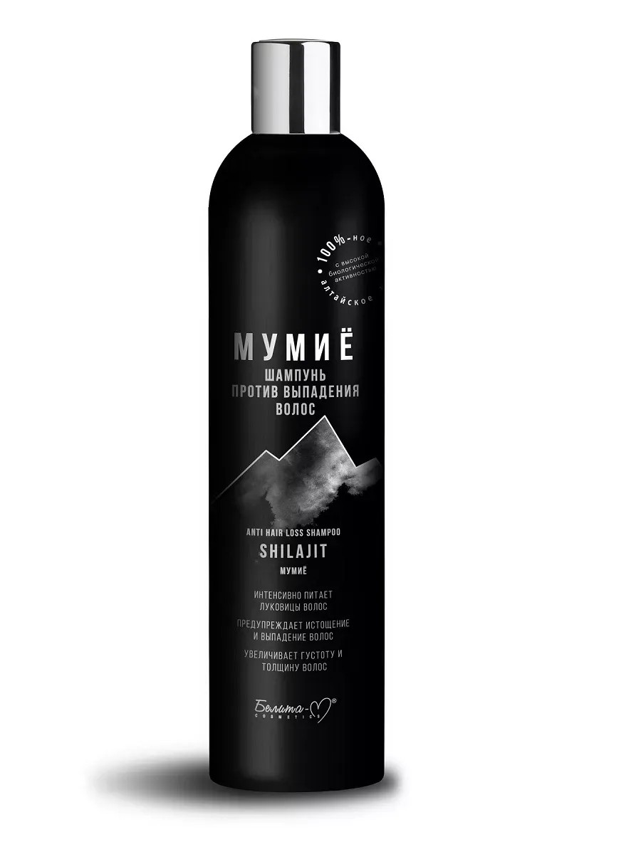 Белита Шампунь против выпадения волос Мумиё, 250мл. Мумиё, дар гор - это ценное природное вещество с высокой биологической активностью. Очищенное мумиё на 80 % состоит из полезных биоактивных компонентов: биофлавоноиды, фосфолипиды, эфирные масла, смолы, ферменты, хлорофилл, аминокислоты и жирные кислоты, витамины В 1, B2, B3, B6, В12, С, Е, каротиноиды. минеральные вещества: кальций, магний, калий, цинк. Шампунь укрепляет и восстанавливает структуру волос, стимулирует питание корней, способствует пробуждению спящих фолликулов волоса и помогает вырастить из неактивной луковицы новый, более крепкий волос. Рекомендуется для профилактики выпадения волос, а также для восстановления здоровой микрофлоры кожи головы, для роста более густых, плотных волос. Результат применения серии Мумиё- снижается потеря волос, волосы становятся визуально гуще, более плотными и крепкими. Активные компоненты: Мумиё алтайское очищенное; Экстракт овса; Пантенол Действие: Предотвращает потерю волос; Стимулирует рост новых волос; Увеличивает густоту (плотность) волос. Способ применения: