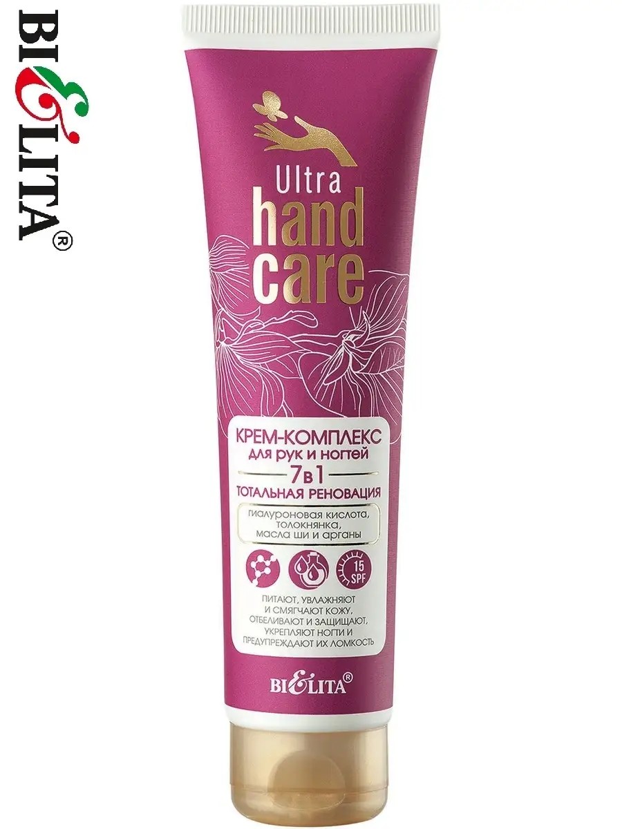 7-in-1 Hand Cream Complex Total Renovation ULTRA HAND CARE Belita. It has a regenerating effect on the skin of the hands and nails, resulting in stronger nails and soft, velvety hands. Hyaluronic acid moisturizes the skin, rejuvenates it, and improves firmness and elasticity. Lumiskin and bearberry extract help reduce hyperpigmentation and lighten age spots. Shea and argan oils nourish and soothe the skin, strengthening the nail plate. A UV filter prevents photoaging and the appearance of new age spots.