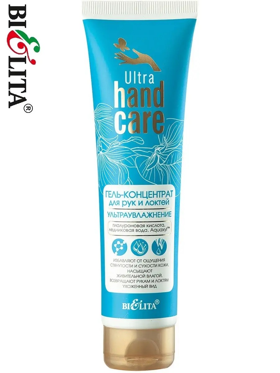 Belita ULTRA HAND CARE Ultra-Moisturizing Gel Concentrate for Hands and Elbows. Intensively moisturizes, softens, and smoothes the skin of the hands and elbows. It is especially indispensable for skin prone to dryness and roughness. Hyaluronic acid effectively hydrates the skin at multiple levels, retaining moisture in the upper layers, improving its firmness and elasticity. Aquaxyl restores the skin's moisture balance, protects it from dryness and dehydration, and leaves it soft and silky. Olive oil intensively nourishes and softens the skin, eliminating dryness and roughness.