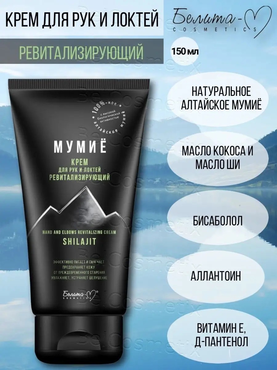 Крем сохранит красоту и молодость рук, вернет коже ощущение мягкости и бархатистости. Поможет смягчить огрубевшую кожу локтей, предотвратит шелушение и растрескивание. Активные компоненты: натуральное алтайское мумиё, масло ши, масло кокоса, бисаболол, витамин Е, Д-пантенол, аллантоин. Действие: смягчает и увлажняет кожу рук, насыщает питательными элементами, предохраняет кожу от преждевременного старения, придает гладкость и бархатистость, оказывает заживляющее и успокаивающее действие.Объем: 150г.Ревитализирующий крем для рук и локтей с МУМИЁ станет прекрасным подарком для любого праздника, будь то 8 марта, Новый Год или приятным сюрпризом без повода. Соберите бьюти бокс, используя средства из линейки МУМИЁ.подарок/идеи для подарка/бьюти-бокс/подарок любимой/косметический набор/набор косметики/подарочный набор/подарок подруге Способ применения: нанесите крем на чистую кожу рук и локтей, мягко массируйте до полного впитывания.