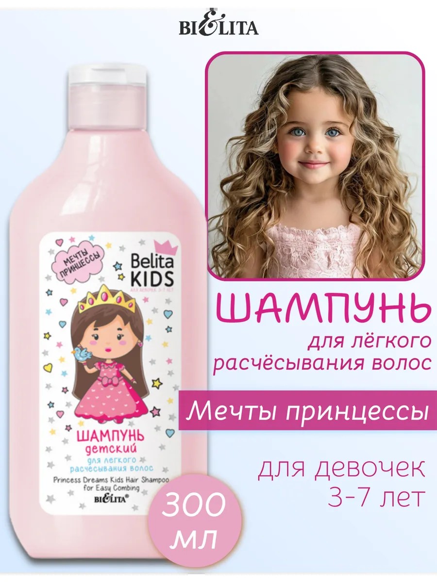 Детский шампунь для легкого расчесывания волос Мечты принцессы от Belita Kids — это отличный выбор для девочек в возрасте от 3 до 7 лет. Объем 300 мл шампуня обеспечивает длительное использование и заботу о нежных волосах вашей маленькой принцессы.