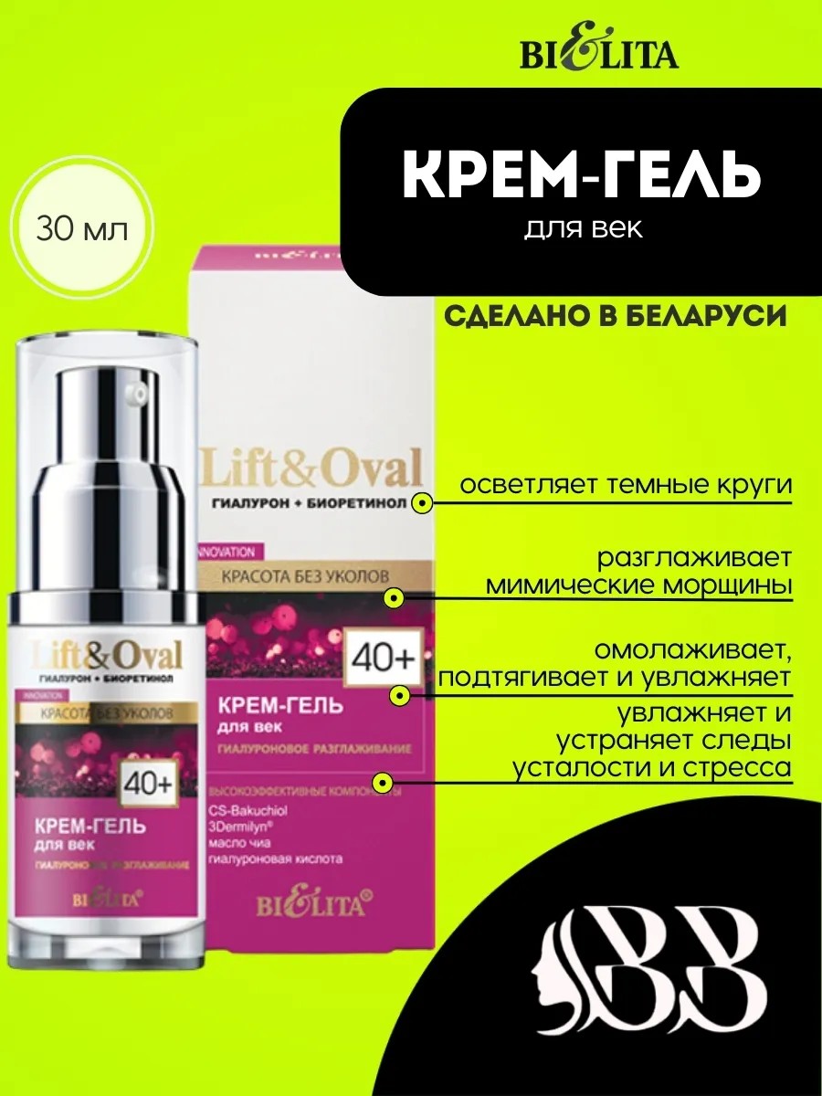 Крем-гель для век «Гиалуроновое разглаживание» Lift&Oval 40+ Bielita — это новейшее средство, созданное для заботы о деликатной области вокруг глаз, которое поможет вам выглядеть ухоженной и свежей в любом возрасте. Специально разработанная формула направлена на борьбу с признаками старения и помогает сохранять молодость вашей кожи.