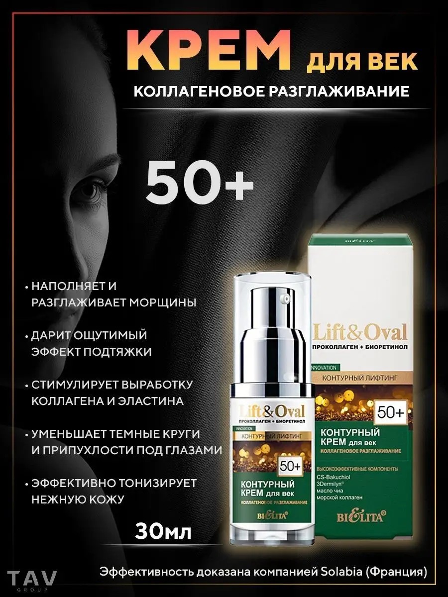 Lift&Oval 50+ Eye Cream is an innovative eye care product designed specifically for women over 50. This cream offers a unique combination of actions that include plumping and smoothing wrinkles, a lifting effect, stimulating collagen and elastin production, and reducing dark circles and puffiness under the eyes. Thanks to its effective toning properties, this eye cream is ideal for moisturizing, reducing puffiness, and providing anti-aging care for the delicate skin around the eyes. The cream's formula is suitable for all skin types, providing deep hydration and improving overall skin condition.