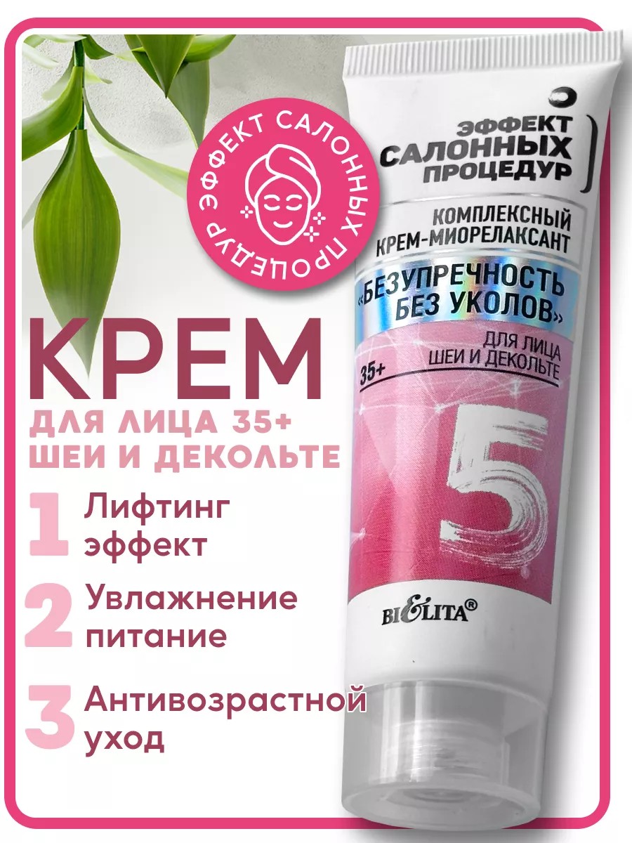 Комплексный крем-миорелаксант «Безупречность без уколов» для лица, шеи и декольте 35+ благодаря активным компонентам:сокращает мимические морщины и тонкие линии, обеспечивая стойкий эффект разглаживания;поддерживает биологические функции кожи; увеличивает содержание влаги в коже, восстанавливая естественный уровень увлажнённости; насыщает кожу необходимыми микроэлементами, витаминам и аминокислотами; Комплекс-МИОРЕЛАКСАНТ блокирует сокращение лицевых подкожных мышц, что приводит к их расслаблению и, как следствие, разглаживанию мимических морщин буквально через несколько часов после нанесения крема. BoNT-L-Peptide – пептид-блокатор, обладающий ботулотоксиноподобным действием, ингибирует передачу нервных импульсов, блокируя сокращения мимических мышц, что приводит к уменьшению выраженных морщин на лице, шеи и зоны декольте. Tens`Up – активный ингредиент, который обеспечивает мгновенный эффект лифтинга, оказывает омолажвающее действие на кожу за счет стимулирования синтеза коллагена. Масло ши - усиленно питает кожу, устраняя чувство сухости и стянутости, восстанавливает гидролипидный барьер. Инновационное антивозрастное средство - увлажняющий крем для лица, шеи и декольте. Созданная специально для сухой кожи женщин, эта косметика обеспечит возможность подарить вашей коже максимальный уход. Уникальная формула крема-миорелаксанта помогает бороться с первыми признаками старения, разглаживая морщины и придавая лицу свежий вид. Особенности этого профессионального средства в том, что оно интенсивно увлажняет и омолаживает кожу. В его состав входят активные компоненты, способствующие лифтингу и подтягиванию кожи, придавая ей гладкое и упругое состояние. Крем также способствует сохранению естественного сияния и безупречности вашей кожи. Белорусская косметика известна своим высоким качеством, и этот крем не исключение. Очень популярный среди женщин всех возрастов, он является отличным подарком для вашей любимой мамы, сестры или девушке