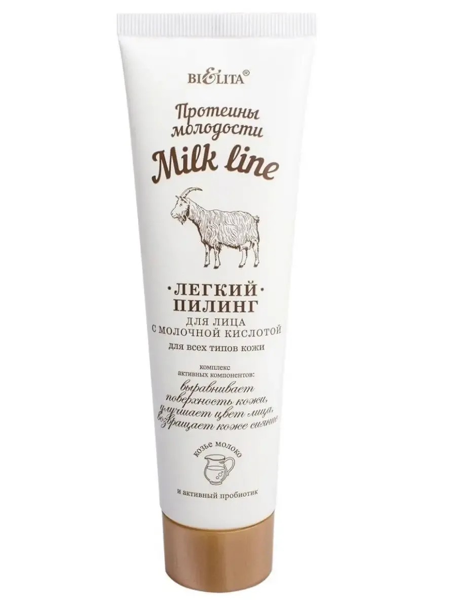 Belita Milk line, Легкий пилинг для лица с молочной кислотой для всех типов кожи Протеины молодости 100 мл. Легкий пилинг благодаря активной формуле, содержащей молочную кислоту, мягко очищает кожу, отшелушивает омертвевшие клетки эпидермиса и сужает поры. При регулярном использовании дарит коже невероятную свежесть, безупречную чистоту и сияние. Протеины козьего молока в комплексе с активным пробиотиком омолаживают, питают и смягчают кожу, делая ее нежной и шелковистой. TONISKIN стимулирует синтез коллагена, разглаживает морщины и выравнивает цвет лица. Комплекс витаминов A,C,E,F обладает высокой антиоксидантной активностью, улучшает клеточную регенерацию кожи, благодаря чему кожа быстрее обновляется и выглядит моложе. Масло кокоса мгновенно восстанавливает и питает кожу.