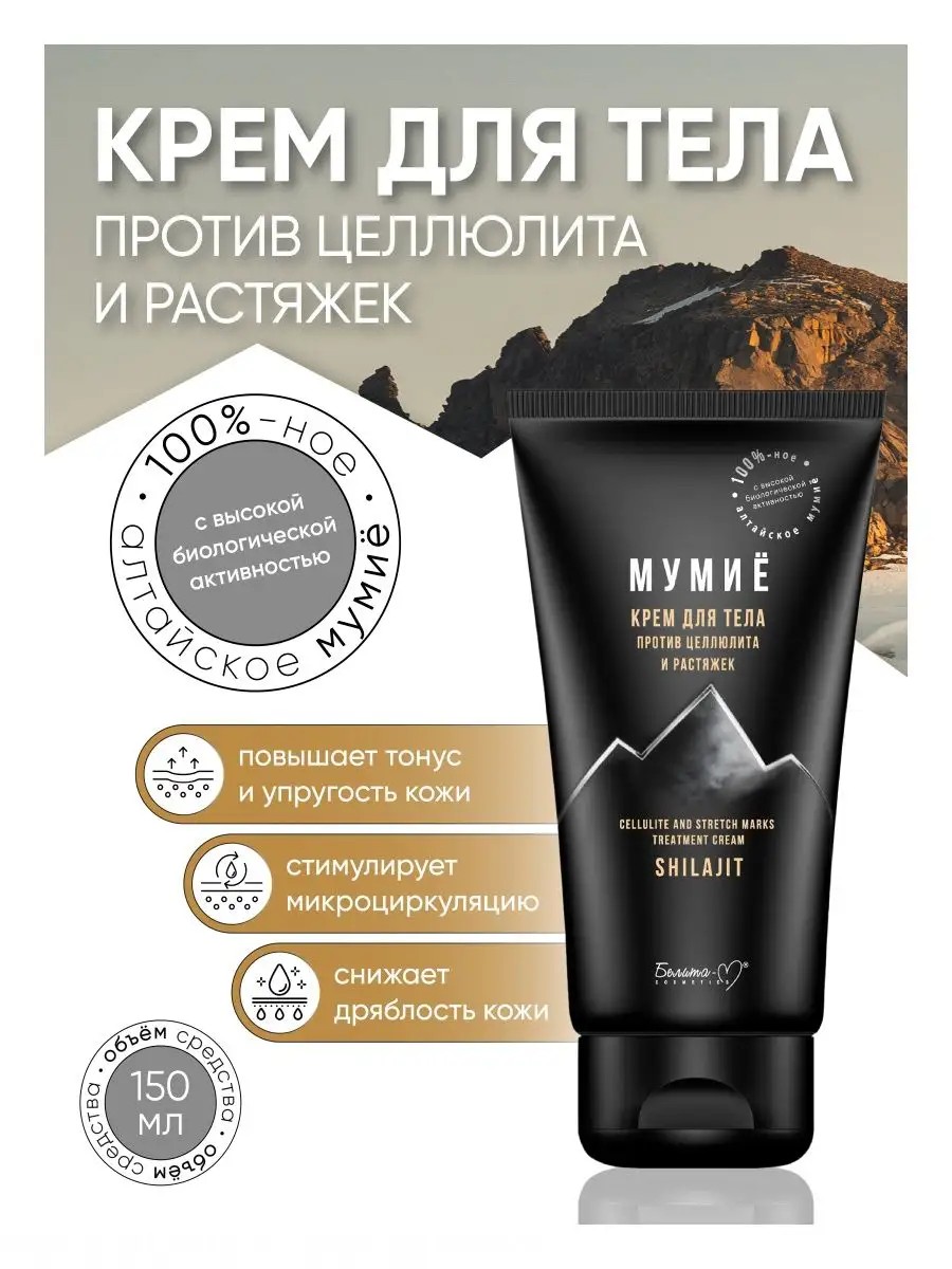 This cream is formulated with natural Altai mumiyo, an effective remedy against cellulite, stretch marks, scars, and other skin imperfections. Mumiyo, supplemented with a complex of active ingredients, stimulates fat breakdown, reduces tissue water content, has an anti-cellulite effect, and improves skin firmness and elasticity. The cream's active formula includes: Hydrovance deeply moisturizes the skin, improving elasticity; Menthol stimulates microcirculation in cells, refreshes the skin; Caffeine invigorates the skin, providing an active lymphatic drainage effect. Ginger extract improves skin tone and elasticity; Elastin makes the skin firm, resistant to sagging and stretch marks. Shea, almond, and coconut oils nourish, soften, and smooth the skin. The cream's components stimulate the breakdown of fat deposits, enhance subcutaneous fluid drainage, and smooth and tighten the skin. Directions: Massage the cream into problem areas until fully absorbed. Use daily, morning and evening.