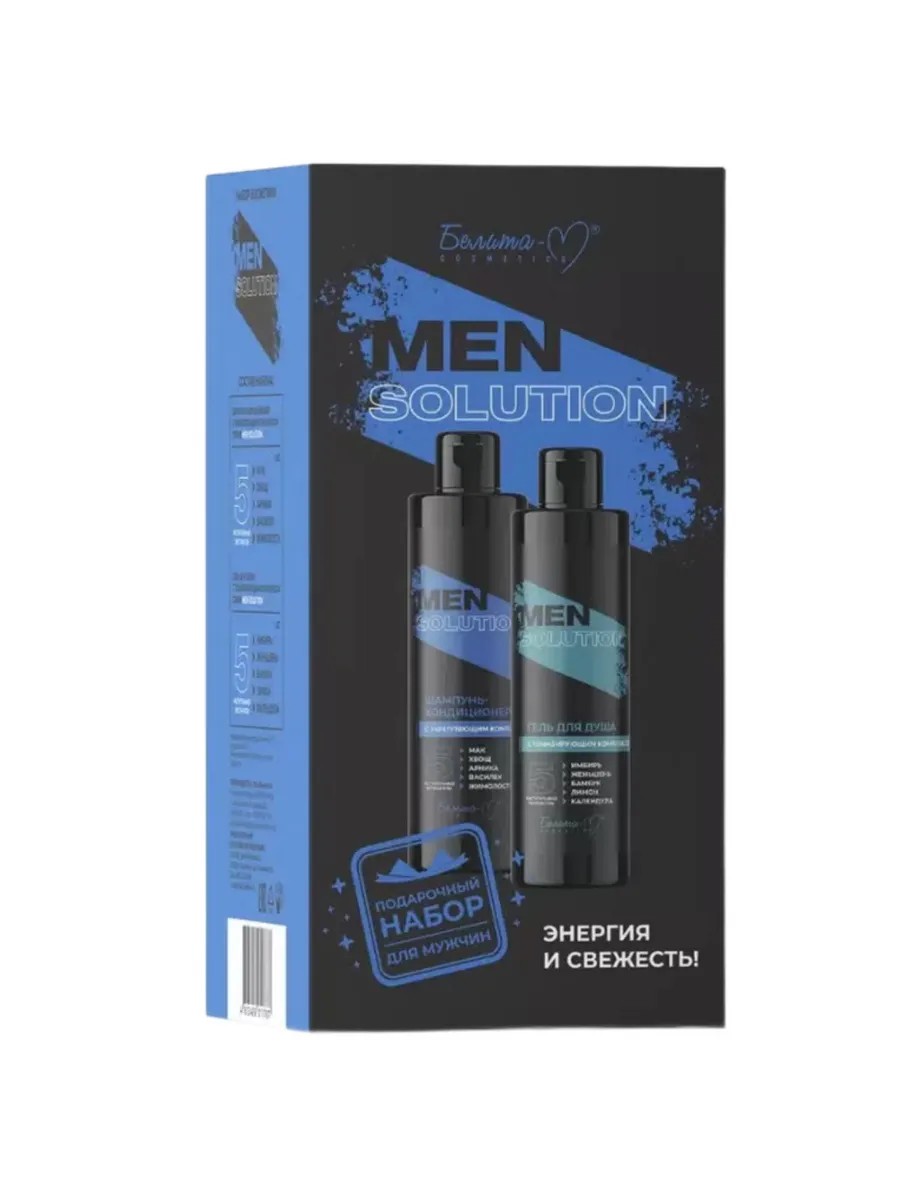 Белита-М, набор косметики, MEN SOLUTION, 400 г. Bielita Гель для душа и Шампунь для волос. Ищите где купить мужской подарочный набор на праздники. Тогда вы его нашли. Прекрасный вариант для Вашего мужчины в качестве подарка. Лаконичный дизайн и ничего лишнего только то, что необходимо на каждый день даже самым брутальным мужчинам, чтобы быть уверенным в своем внешнем виде на все 100%. Активная формула с комплексом растительных экстрактов обеспечивает максимальный уход. Подходит для ежедневного применения для всех типов волос и кожи. Компоненты эффективны и просты в применении, созданы с учетом особенностей строения мужской кожи и волос, и обладают по-настоящему мужественным, бодрящим ароматом, в основе которого микс свежей бодрости и сексуальной пряности, с тонким древесным акцентом. Состав набора 1.Гель для душа с тонизирующим комплексом МEN Solution, 400г эффективно и быстро удаляет загрязнения с поверхности кожи, придает телу свежесть, дарит бодрость на целый день. Ухаживающая формула тщательно очищает кожу, возвращая комфортное ощущение безупречной свежести. Гель образует мягкую пену, которая легко смывается, не оставляя липкости. Терпкий бодрящий аромат дарит хорошее настроение и заряжает энергией на весь день. Тонизирующий комплекс растительных экстрактов обеспечивает максимальный уход. Для всех типов кожи. Активные компоненты: экстракт имбиря, экстракт женьшеня, экстракт бамбука, экстракт лимона, экстракт календулы. Действие освежает и снимает усталость, нормализует метаболизм и восстанавливает энергетический баланс клеток, питает и увлажняет кожу, регулирует работу сальных желез, оказывает антибактериальное действие и эффективно заживляет микроповреждения.