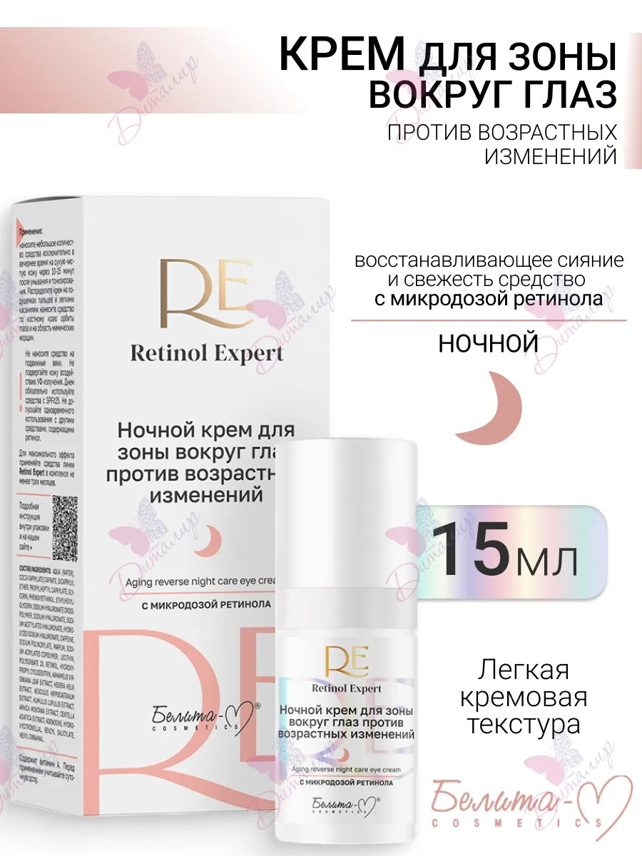 Крем для зоны вокруг глаз ночной Retinol Expert Белита-М - это эксклюзивный продукт, предназначенный для глубокого восстановления и улучшения состояния кожи вокруг глаз. Специализированный состав с ретинолом активирует процессы обновления клеток, способствуя уменьшению морщин и повышению упругости кожи. Применение этого крема ночью позволяет коже отдохнуть и восстановиться, обеспечивая заметное улучшение сияния и здоровья кожи уже после нескольких применений. Эффективное действие крема направлено на восстановление естественной упругости и эластичности кожи, делая взгляд более свежим и оживленным. Способ применения: наносите небольшое количество средства исключительно в вечернее время на сухую чистую кожу через 10-15 минут после умывания и тонизирования. Распределите крем на подушечках пальцев и легкими касаниями нанесите средство по костному краю орбиты глаза и на область мимических морщин. Не наносить средство на подвижные веки! Не подвергать кожу воздействию УФ-излучения. Днем обязательно использовать средства с SPF≥25. Не использовать с другими средствами, содержащими ретинол. Для максимального эффекта применяйте средства линии Retinol Expert в комплексе не менее трех месяцев.