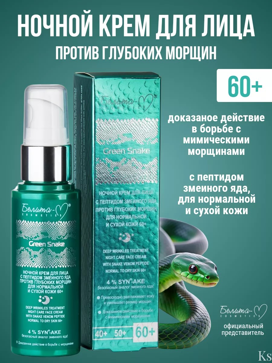 The exquisite Green Snake Night Face Cream for 60+ from the Belarusian cosmetics brand Belita-M provides mature skin with comprehensive nighttime care, infusing it with vital energy and leaving it looking incredibly fresh and rested upon awakening.