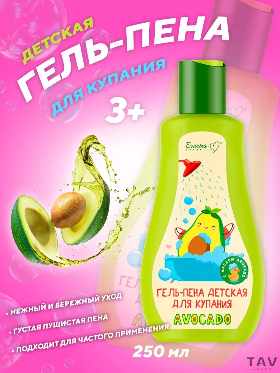 BATHING GEL FOAM FOR BABY - Gentle and caring care. Thick, fluffy foam. Suitable for frequent use. This product with a mild, pH-balanced formula creates a multitude of magical foaming bubbles and thoroughly cleanses the skin. The appetizing aroma of peach and creamy caramel turns bathing into a true foaming holiday. Active ingredients: avocado oil, avocado extract, a complex of cleansing components. Action: gently and thoroughly cleanses without overdrying the skin, nourishes and soothes, helps relieve dryness and irritation, reduces flaking and adds softness. Purpose: Nourishing, Softening, Cleansing, Bath foam. Directions: Apply the product to a damp sponge, lather, gently massaging into baby's skin, then rinse with warm water. For bathing, lather 30-50 ml of gel foam under running water. AVOCADO children's cosmetics are designed for gentle daily care of baby's delicate skin and hair. The formulas are based on avocado extract and oil: They nourish and soothe, help relieve dryness and irritation, reduce flaking, and leave the skin soft while maintaining its natural protective barrier. They infuse hair with strength, add silkiness and shine, and protect against split ends. The line's products have a bright and delicious scent, making caring for baby's skin a joyful little celebration.