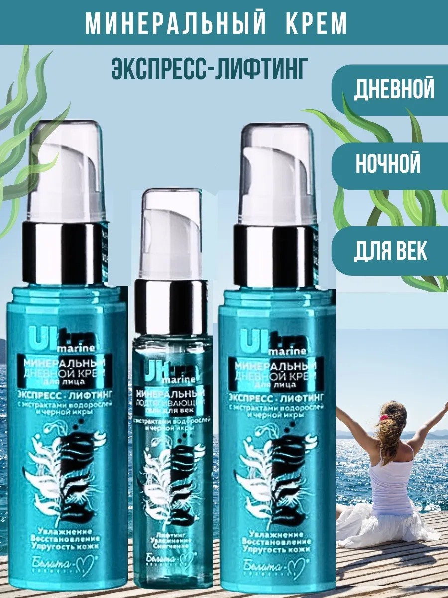 | Комплектация | Минеральный дневной крем для лица экспресс-лифтинг с экстратами водорослей и черной икры; Минеральный ночной крем для лица экспресс-лифтинг с экстратами водорослей и черной икры; Минеральный подтягивающий гель для век с экстрактами водорослей и черной икры |