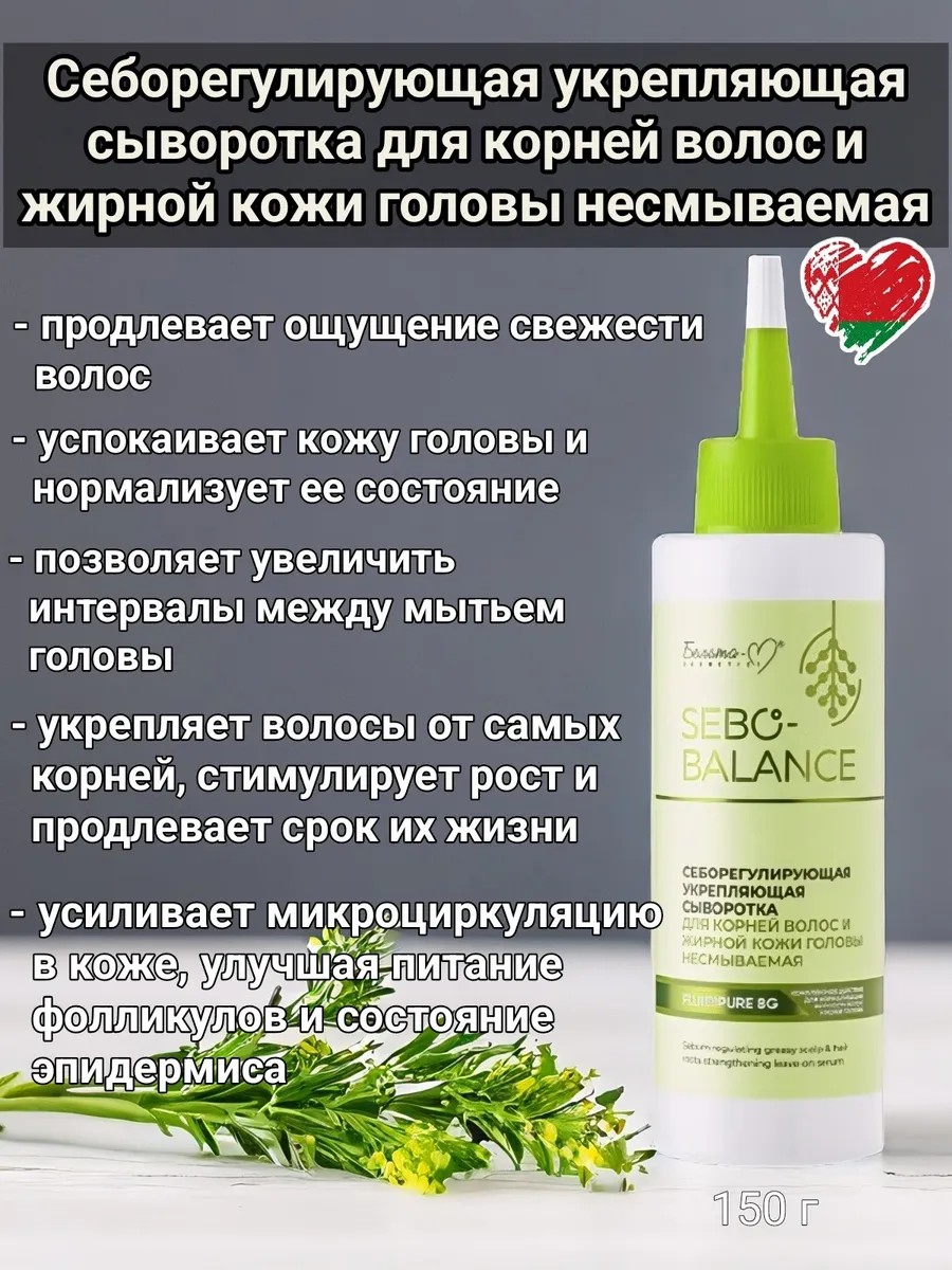 Sebum-regulating strengthening serum for hair roots and oily scalp, leave-in. The serum's balanced formula provides a comprehensive effect to normalize the oiliness of hair and scalp. Without silicones, mineral oil, or dyes. Active ingredients: FLUIDIPURE 8G (biovector of glycine, vegetable sugar); CRESSATINE; niacinamide (vitamin B3); guava and sage extracts. Action: prolongs the feeling of hair freshness; soothes the scalp and normalizes its condition; allows you to extend the intervals between shampoos; strengthens hair from the roots, stimulates growth and prolongs its life; enhances microcirculation in the skin, improving follicle nutrition and the condition of the epidermis. How to use: apply the serum to clean scalp along partings and massage gently. No rinsing required. Use 2-3 times a week.